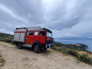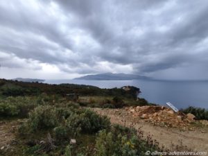 Nachdem wir alles gesehen und ein paar Fledermäuse aus Versehen aufgeschreckt hatten, gingen wir zu Allmo zurück und nahmen Kurs auf Griechenland. Tatsächlich fing es nun etwas stärker an zu regnen und teilweise standen Teile der Straßen von Saranda unter Wasser. Über die Pfützen machte Frank sich wenig Gedanken. Eher darüber, dass man jetzt nicht mehr sehen konnte, falls irgendwo ein Gulli-Deckel fehlt. Dies ist in Albanien recht häufig der Fall. Und je nach Größe des Gullis, würde Allmos Reifen darin verschwinden. Recht bald hatten wir die städtische Bebauung hinter uns gelassen und somit auch die Gefahr in irgendwelche Löcher zu fallen.