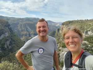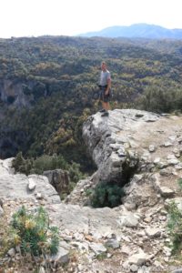 Wir überquerten den Platz und steuerten auf den Canyon zu. Schnell hatten wir einen schönen Blick auf die Felsen, die den Canyon einfassen. Und noch schneller wurde uns klar, dass wir nicht in den Canyon hinabsteigen werden. Ein Wegweiser gab für den Abstieg eine Zeit von 1,5 Stunden vor – für 1 Kilometer. Im Canyon würde ein Wasserfall auf uns warten. Doch bereits von unserem Standort aus konnten wir sehen, dass dort kein Wasser floss. Vielleicht wäre die Kulisse recht nett gewesen, aber die Strapazen des Abstiegs und des Aufstiegs wollten wir uns beide nicht antun. Also drehten wir um und kehrten zu Allmo zurück. Ein jung aussehender schmuddeliger Hund blieb am Canyon zurück. Vielleicht sollten wir auf Wanderungen auch ein paar Schälchen Futter mitnehmen. So ging der Kleine nun leer aus.