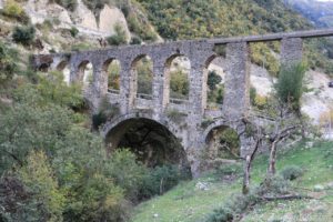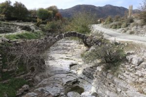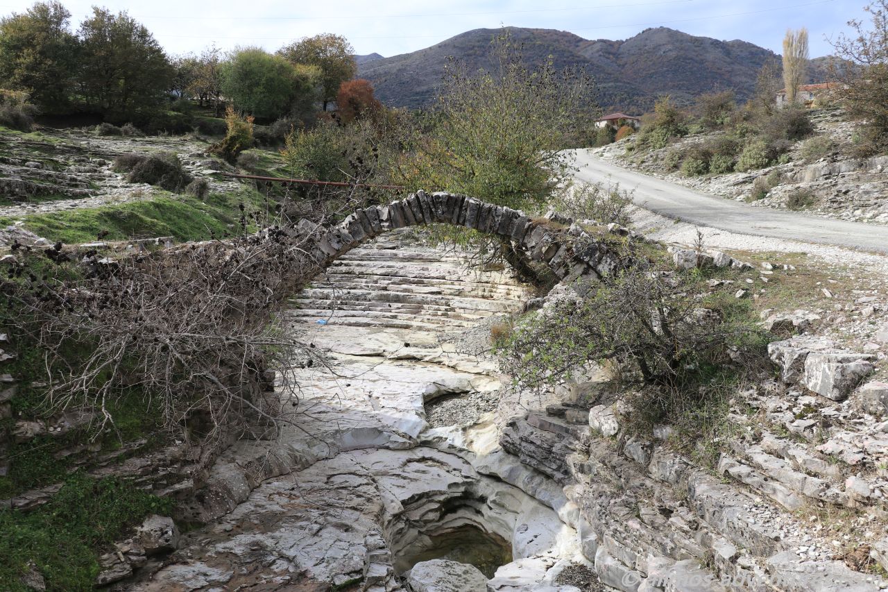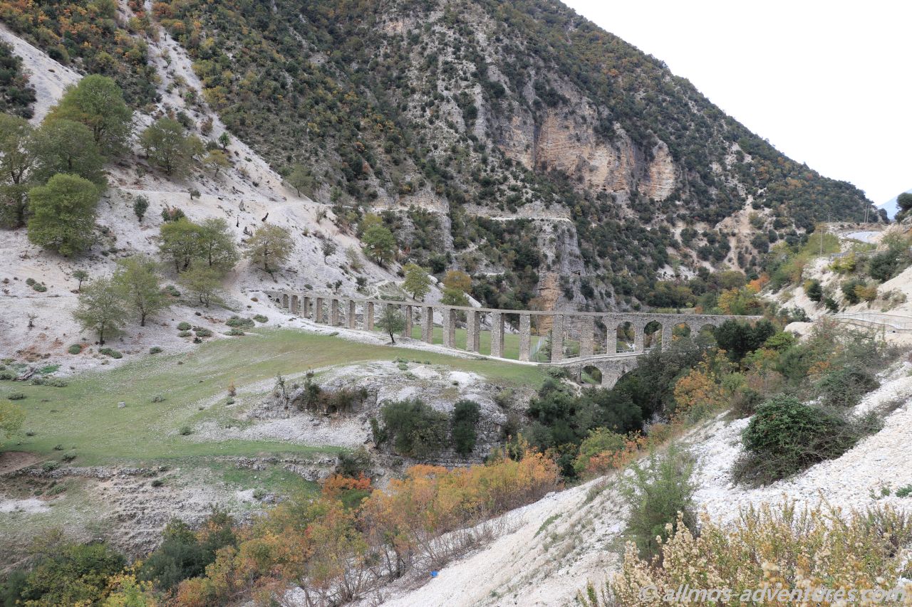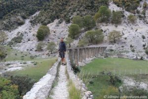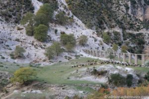 Von um die tausend Höhenmetern fuhren wir mit jedem Kilometer ein Stück hinunter. Unterwegs hielten wir nach einem möglichen Schlafplatz Ausschau. Akzeptabel wäre ein Aussichtspunkt gewesen, von welchem wir fast einen 360-Grad-Blick auf die Kurvelesh Region hatten. Doch die Stromleitungen störten uns. Direkt unter diesen wollten wir nicht übernachten. Also fuhren wir noch ein wenig weiter. Ein paar Serpentinen lagen vor uns und dann erblickten wir auch schon das Ali Pasha Aquädukt.
