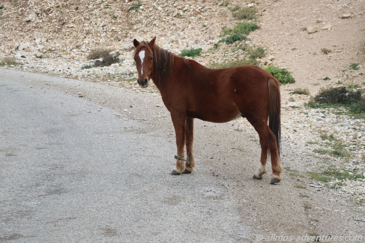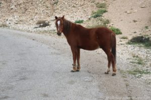 Ein paar Kurven weiter, stoppten wir, weil zwei Pferde mit Fußfesseln die Fahrbahn blockierten. Die armen konnten sich gar nicht richtig fortbewegen. Nur in Trippelschritten. Versuche weg zu hüpfen sahen halsbrecherisch aus. Und dann befanden wir uns auch schon in der Nähe des Ujevara e Peshtures Progonat.