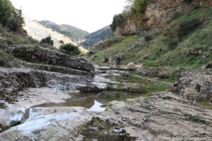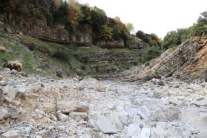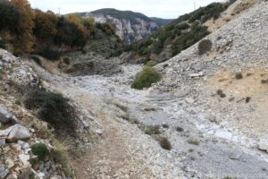 Der Weg führte an einem ausgetrockneten Flussbett vorbei. Rechts neben uns ragten die gelblichen Felsen empor. Links befand sich das kieselige Flussbett.