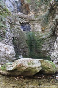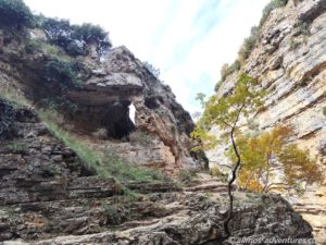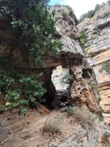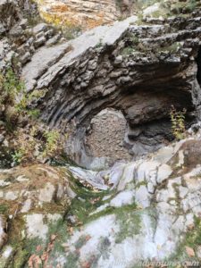 Wir umrundeten einen Felsen, der sich dann als ein Felsbogen entpuppte. Wie durch ein Tor schritten wir durch das Loch im Felsen und hatten sofort den Wasserfall im Blick. Wenn denn Wasser fließen würde. Die Kulisse war dennoch grandios. Denn dort, wo der Wasserfall eigentlich wäre, gab es auch noch einen Felsbogen, wie ein Fenster sah das aus.
