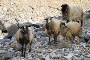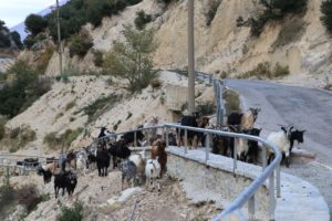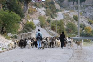 Später bereiteten wir uns das gestern gekaufte Schweinefleisch zu, welches sich als Schnitzel erwies. Dazu gab es gekochte Kartoffeln und Möhren. Während wir das Essen zubereiteten, kam zunächst eine kleine Herde Ziegen und Schafe und dann noch zwei größere Ziegenherden an uns vorbei. Kein Wunder, dass die ganze Straße schwarz gepunktet ist und es auch leicht nach Dung riecht. Einer der Hütehunde hielt uns bellend in Schach, damit wir bloß keine seiner Ziegen klauen.