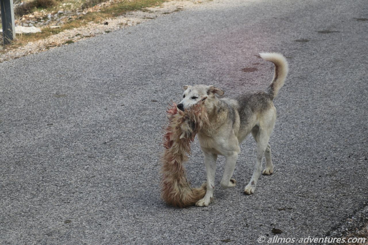 Inzwischen war es Mittagszeit und mangels Brot (das muss noch gebacken werden) verputzten wir die Reste der gebratenen Mettwurst. Wir wollten gerade wieder einsteigen, um weiterzufahren, als ein Hund uns entgegenkam, der irgendwas mit sich schleppte. Wollten wir wirklich wissen, was er da als Beute hat? Sicherheitshalber stiegen wir in Allmo ein. Es stellte sich als ein Stück von einem Schaf heraus. Na, guten Appetit.
