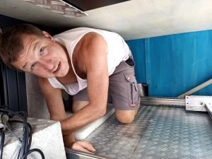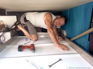 Wir demontierten alles und bauten am nächsten Tag eine starre Schublade. Alles war gut, bis auf die letzten 20 cm. Die blöde Schublade wollte sich nicht weiter reinschieben lassen. Anscheinend war irgendetwas krumm und dadurch konnte die Schublade nicht in den Schienen bis zum Schluss durchlaufen. Somit war wieder ein Tag mit viel Arbeit vergangen, ohne dass wir erfolgreich waren.