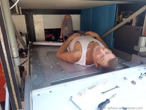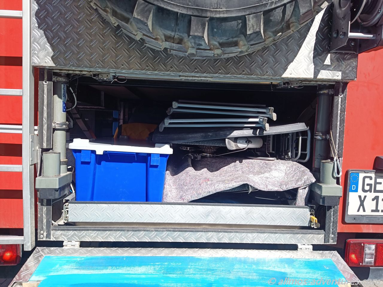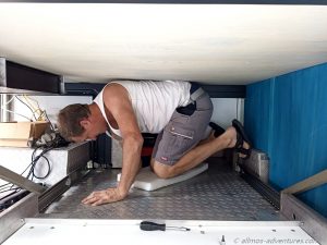 Vielfach wird der Raum unten als Stauraum genutzt. Schön mit Schienensystem und jede Menge Stauboxen da drauf. Eigentlich eine feine Sache, bloß dass wir dann keine Möglichkeit hätten unsere Fahrräder mitzunehmen. Wir hatten uns zwar bewusst Klappräder zugelegt, die sogar in die Doka passen, doch dann können wir dort nicht mehr sitzen. Außen an Allmo dran hängen wollen wir die Räder auch nicht. Somit blieb nur die hintere Garage für die Fahrräder.