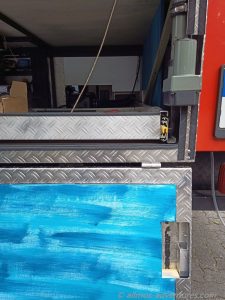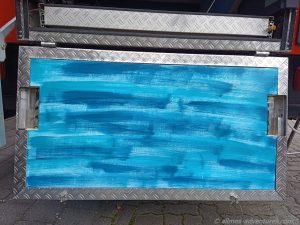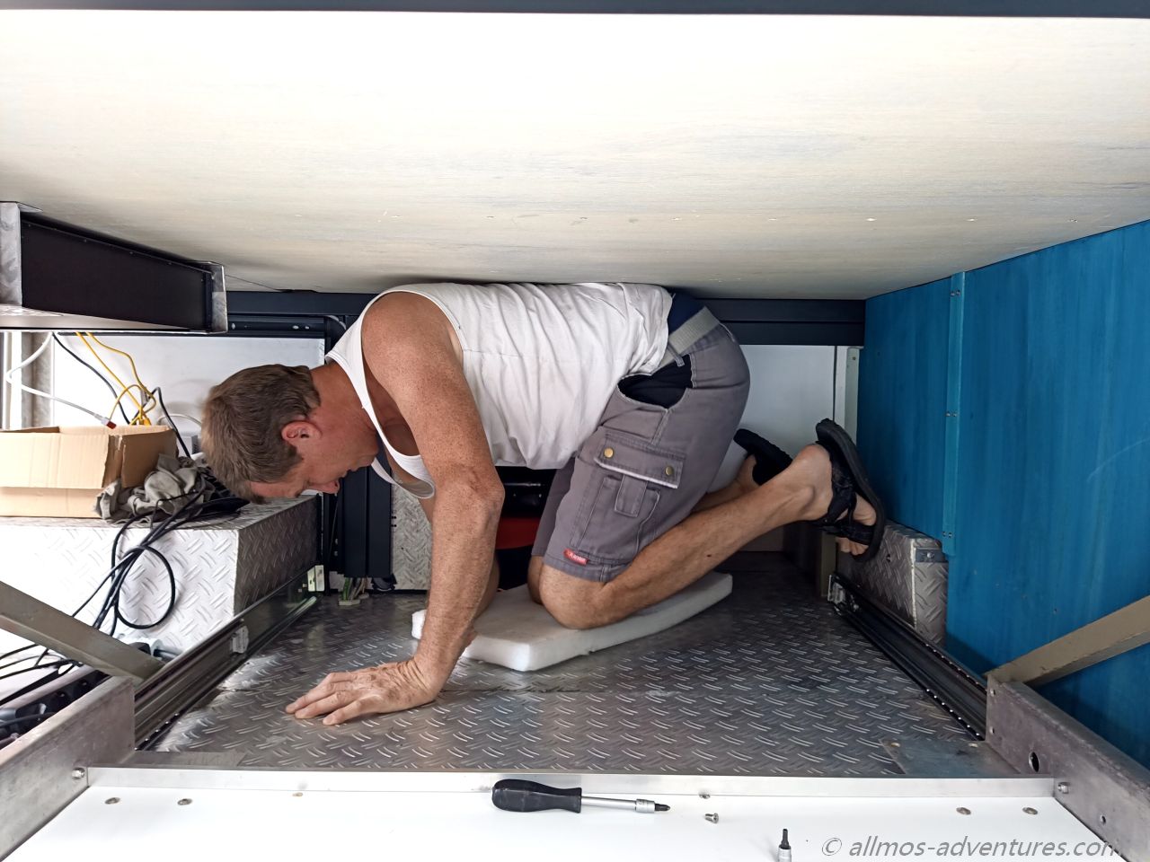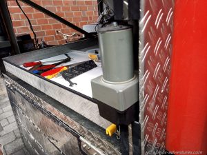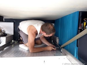 Um die Fahrräder möglichst einfach aus der Garage heraus und wieder herein zu bekommen montierten wir seitlich Schwerlastschienen mit einer Länge von 1,50 m für die wir eine passende Schublade aus vorhandenen Platten und Allmos altem Alu-Riffelblech bauten, die den vollen Platz in Allmos Bauch ausschöpft. Die Räder passen der Länge nach in die Schublade, wenn wir das Lenkrad umklappen. Daneben finden auf jeden Fall noch zwei Eurokisten Platz und mal sehen, was wir dort noch drauf unterbringen werden.