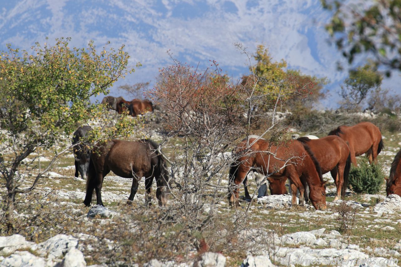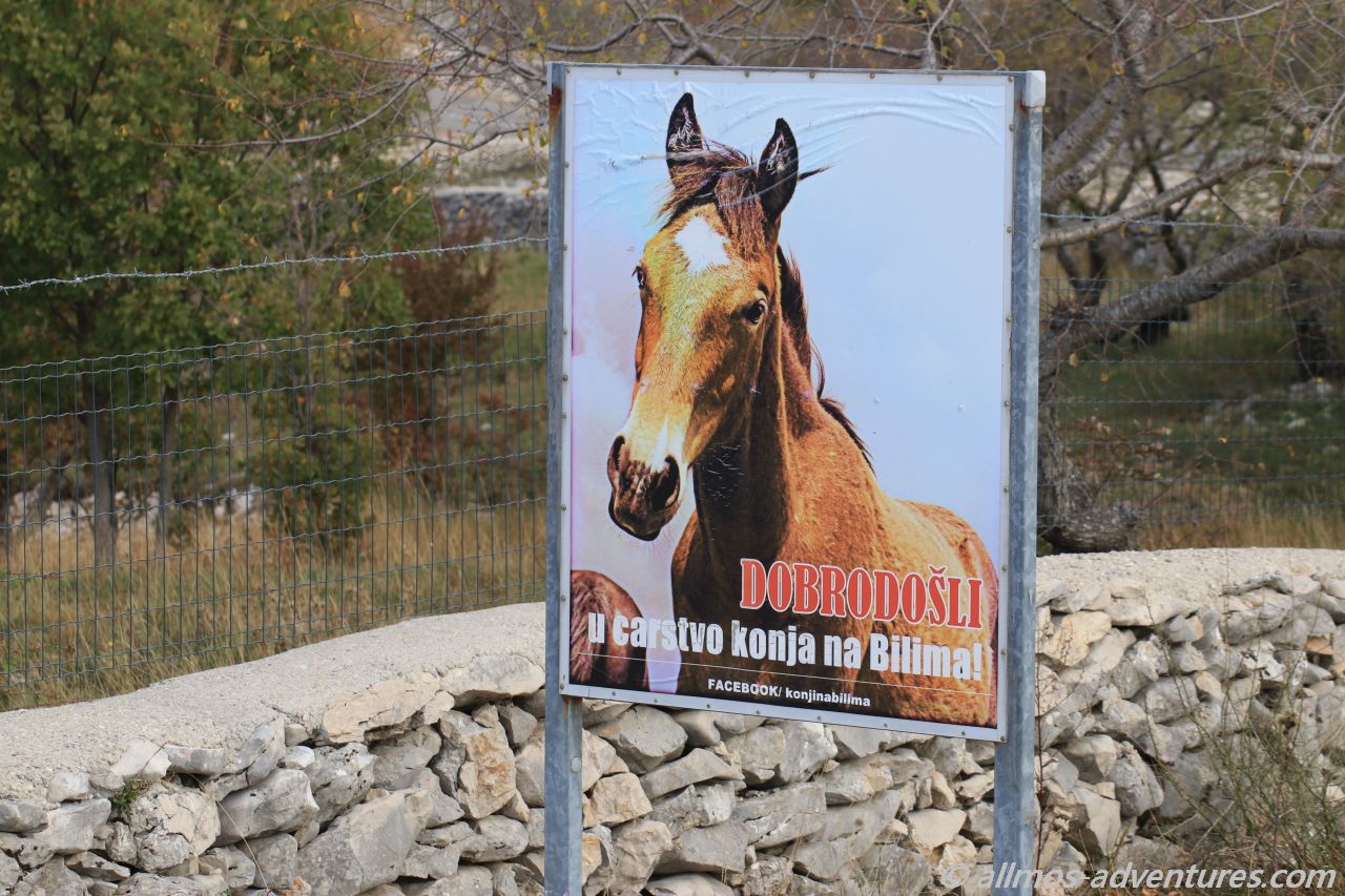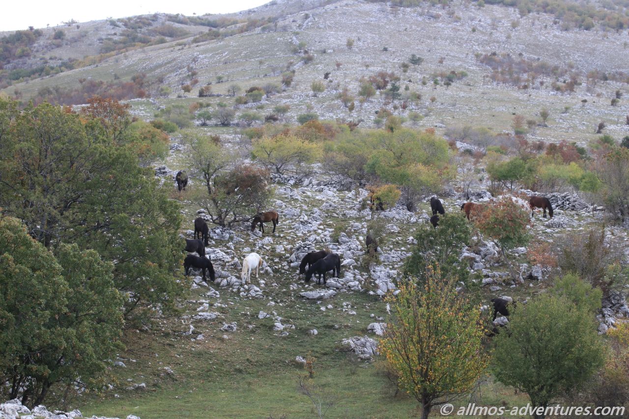 Ein paar Kilometer vor Goranci entdecken wir die ersten plattgefahrenen Pferdeäpfel auf der Straße und wir hielten Ausschau nach den Wildpferden. Und tatsächlich erblickte Frank sie recht bald. Wir parkten Allmo am Wegesrand, schnappten uns die gute Kamera mit dem Teleobjektiv und näherten uns vorsichtig der kleinen, farblich bunt gemischten, Herde.