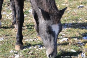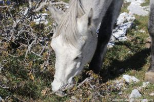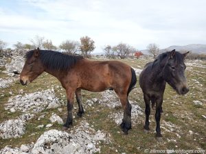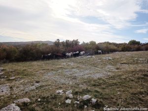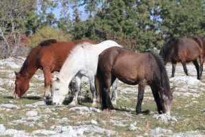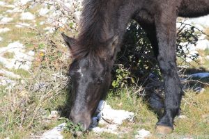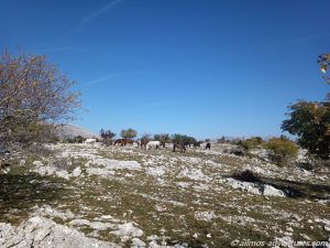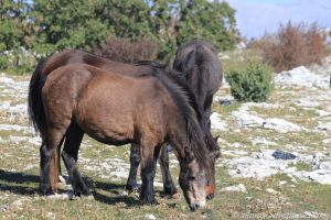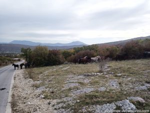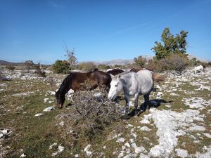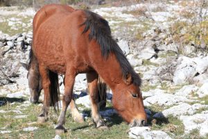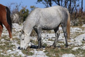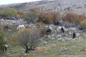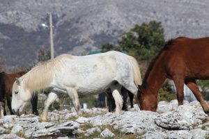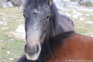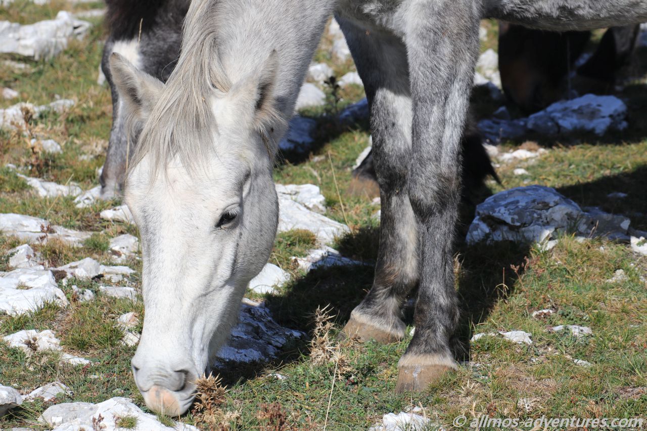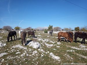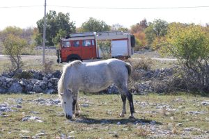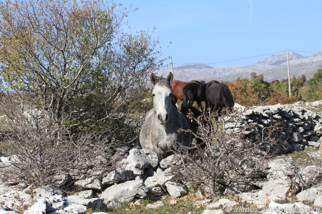Ein paar Kilometer vor Goranci entdecken wir die ersten plattgefahrenen Pferdeäpfel auf der Straße und wir hielten Ausschau nach den Wildpferden. Und tatsächlich erblickte Frank sie recht bald. Wir parkten Allmo am Wegesrand, schnappten uns die gute Kamera mit dem Teleobjektiv und näherten uns vorsichtig der kleinen, farblich bunt gemischten, Herde.