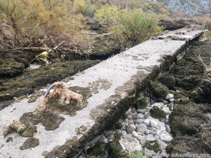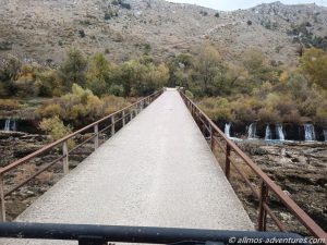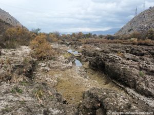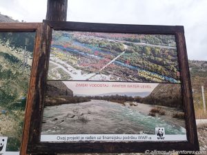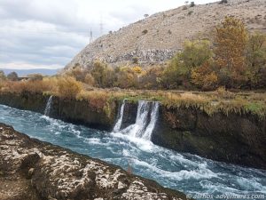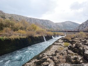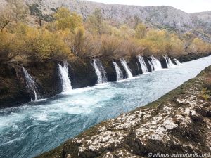 Auf dem Weg zur bosnisch-kroatischen Grenze stoppten wir zunächst hinter Buna, wo der Fluss Buna und der Fluss Neretva aufeinandertreffen. In einer schmalen „Fahrrinne“ schoss das Wasser nur so durch den Buna Kanal. In kleinen Wasserfällen ergoss sich das Wasser in den Kanal. An der tiefsten Stelle ist dieser unvorstellbare 14,5 Meter tief. Ein Foto zeigt die Wasserstände im Sommer und im Winter. Zurzeit war der Wasserstand eindeutig im „Sommermodus“.