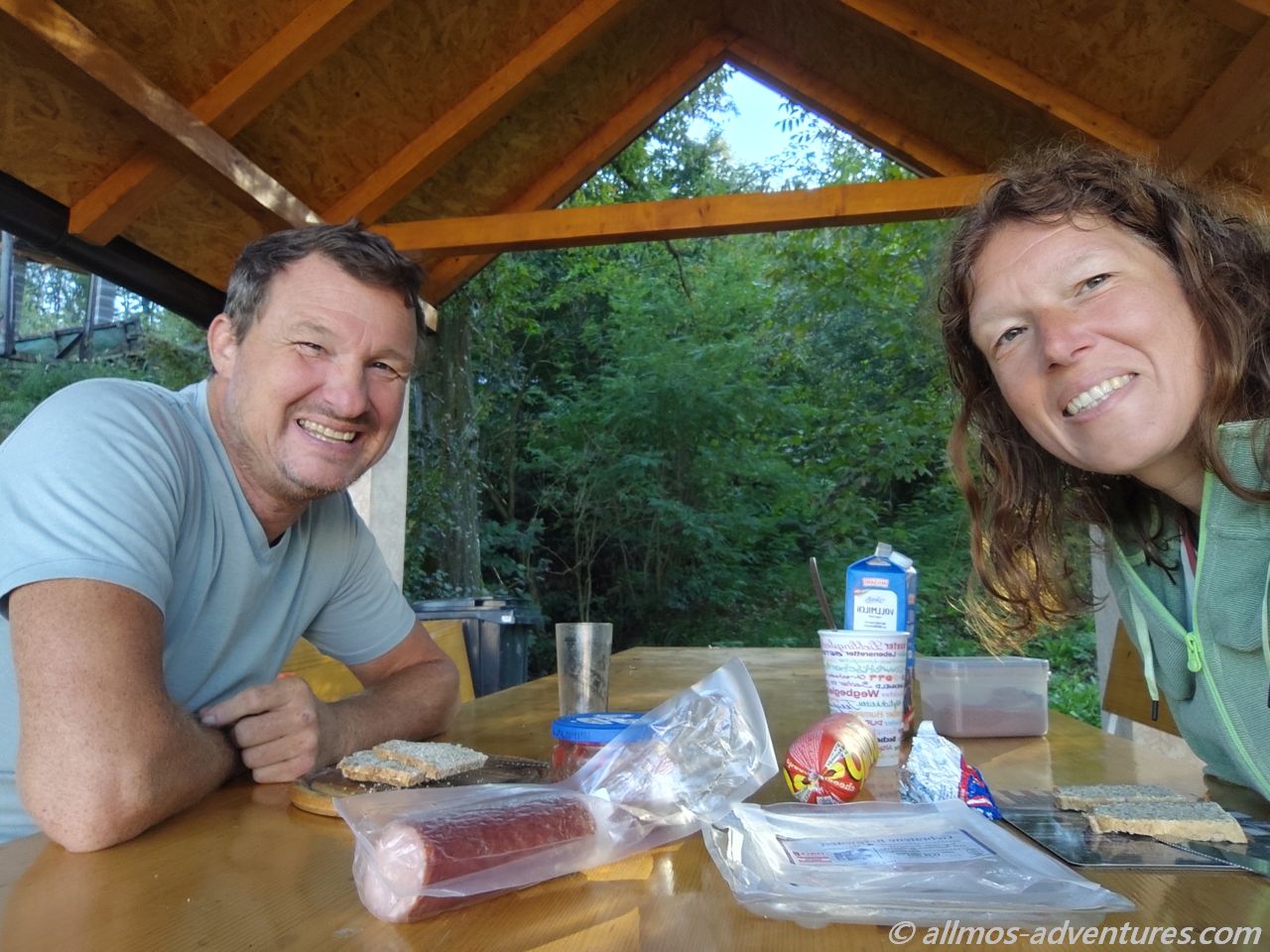 Wir dösten noch eine Weile, bevor wir uns gegen 8 Uhr fertig machten und draußen auf der Picknickbank frühstückten. Diese lag derzeit noch in Allmos Schatten. Nachdem zwei friedliche Hunde noch je ein Schälchen Katzenfutter abgestaubt hatten, starteten wir mit Allmo in den Tag.