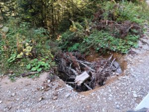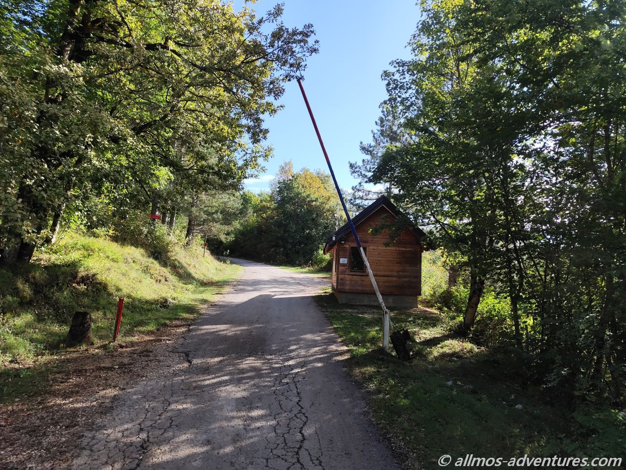 An zwei Stellen war die Fahrspur geschmälert. Die Erde hatte nachgegeben und ein Loch hinterlassen. An einer anderen Stelle lag ein durchgesägter Baumstamm zu beiden Seiten der Piste. Allmo musste ganz schön arbeiten, um uns hoch hinauf nach Prijevor zu bringen. Letztlich benötigten wir für die 19 Kilometer ca. 50 Minuten.