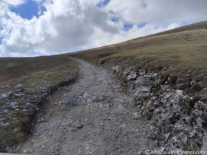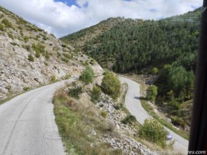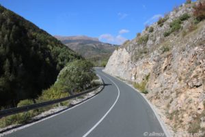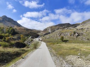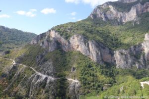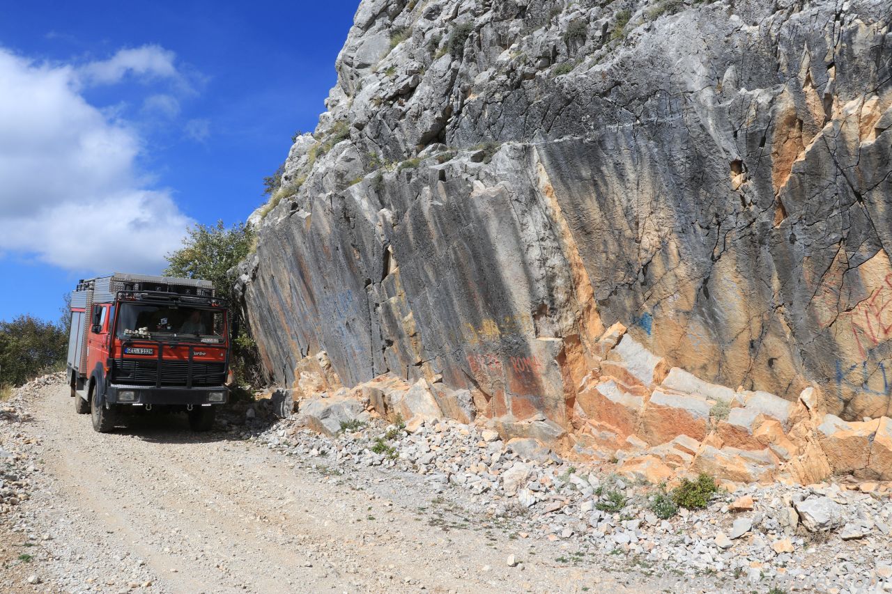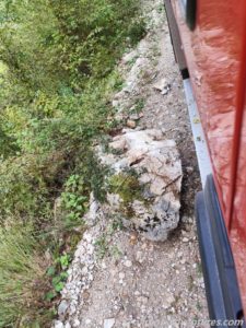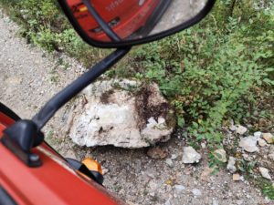 Die ersten sechs Serpentinen meisterten wir ohne Schwierigkeiten. Nach einer etwas geraderen Strecke warteten vier weitere Serpentinen auf uns. Vor der vorletzten Serpentine witzelte ich noch, was wir machen, wenn an der Brücke ein 3,5 Tonnen-Schild stehen würde. Frank gab mir darauf keine Antwort. Doch dann lag vor der letzten Haarnadelkurve ein ganz anderes Problem auf unserem Weg. Ein mega dicker Felsbrocken, der „nicht mal eben“ von der Straße zu schieben ging.