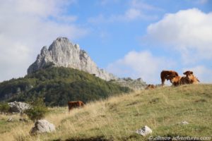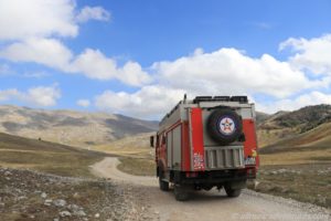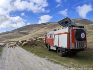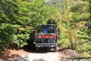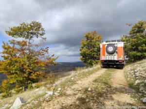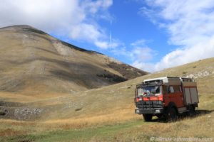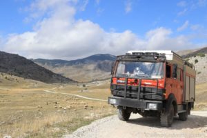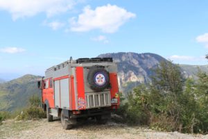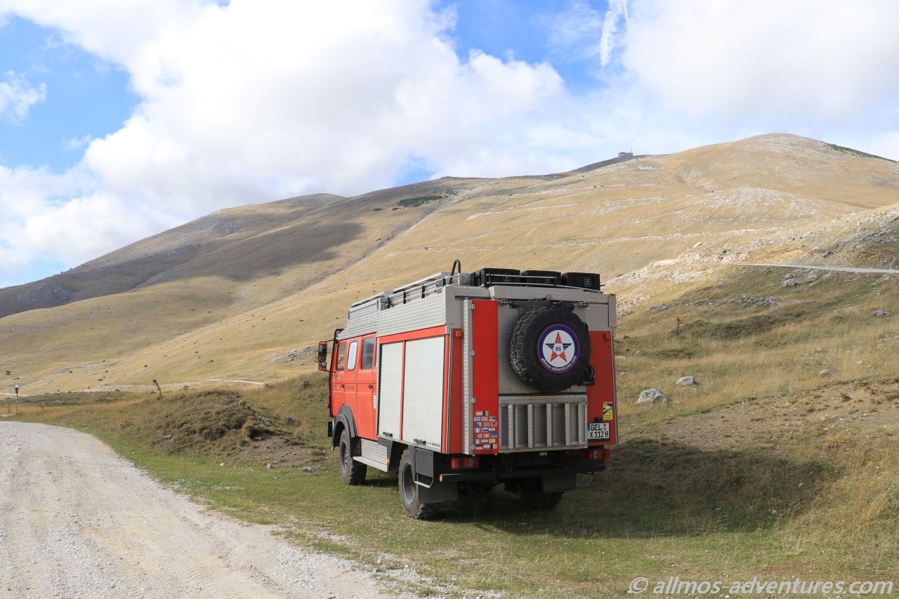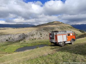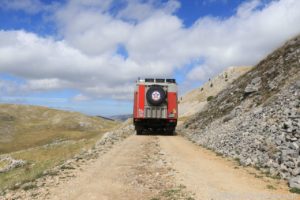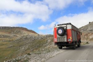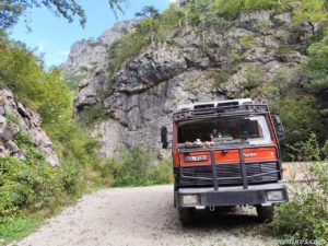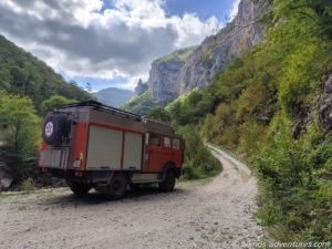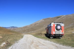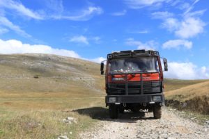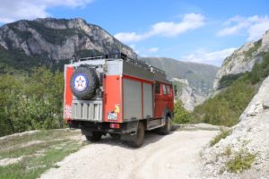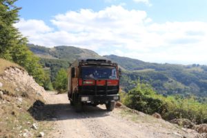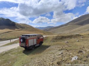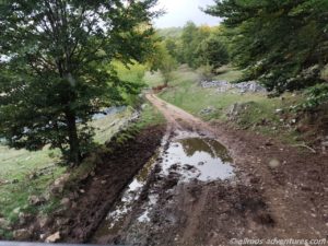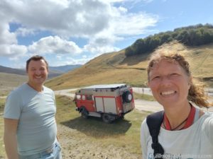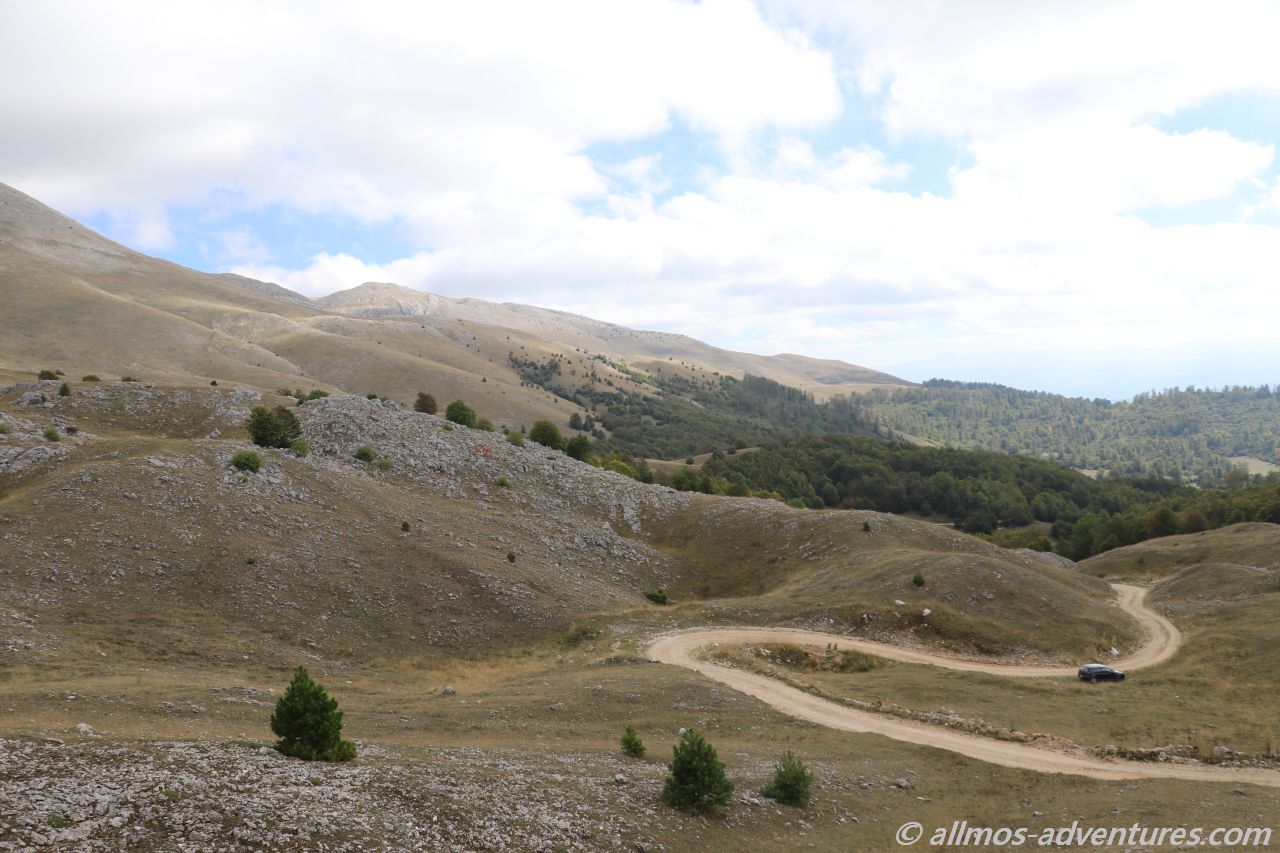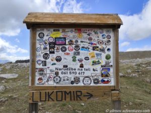 Anstatt rechts nach Lukomir, dem höchstgelegensten Dorf von Bosnien, abzubiegen, hielten wir uns links. Auf dem Weg kamen uns mit Abständen mehrere Geländewagen entgegen. Von dem ersten Fahrzeug erfuhren wir, dass es sich um die 5 Mountains Tour handelt, einer organisierten Road-Book-Tour. Quasi off-road fahren unter Betreuung. Dem Organisations-Pritschenwagen folgten mit Abstand 3 weitere Geländewagen (Landrover, Landcruiser, Jeep). Mit dem Paar im Jeep unterhielten wir uns ein wenig.