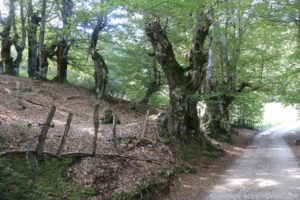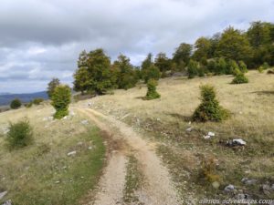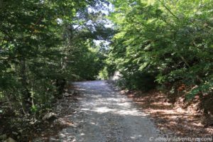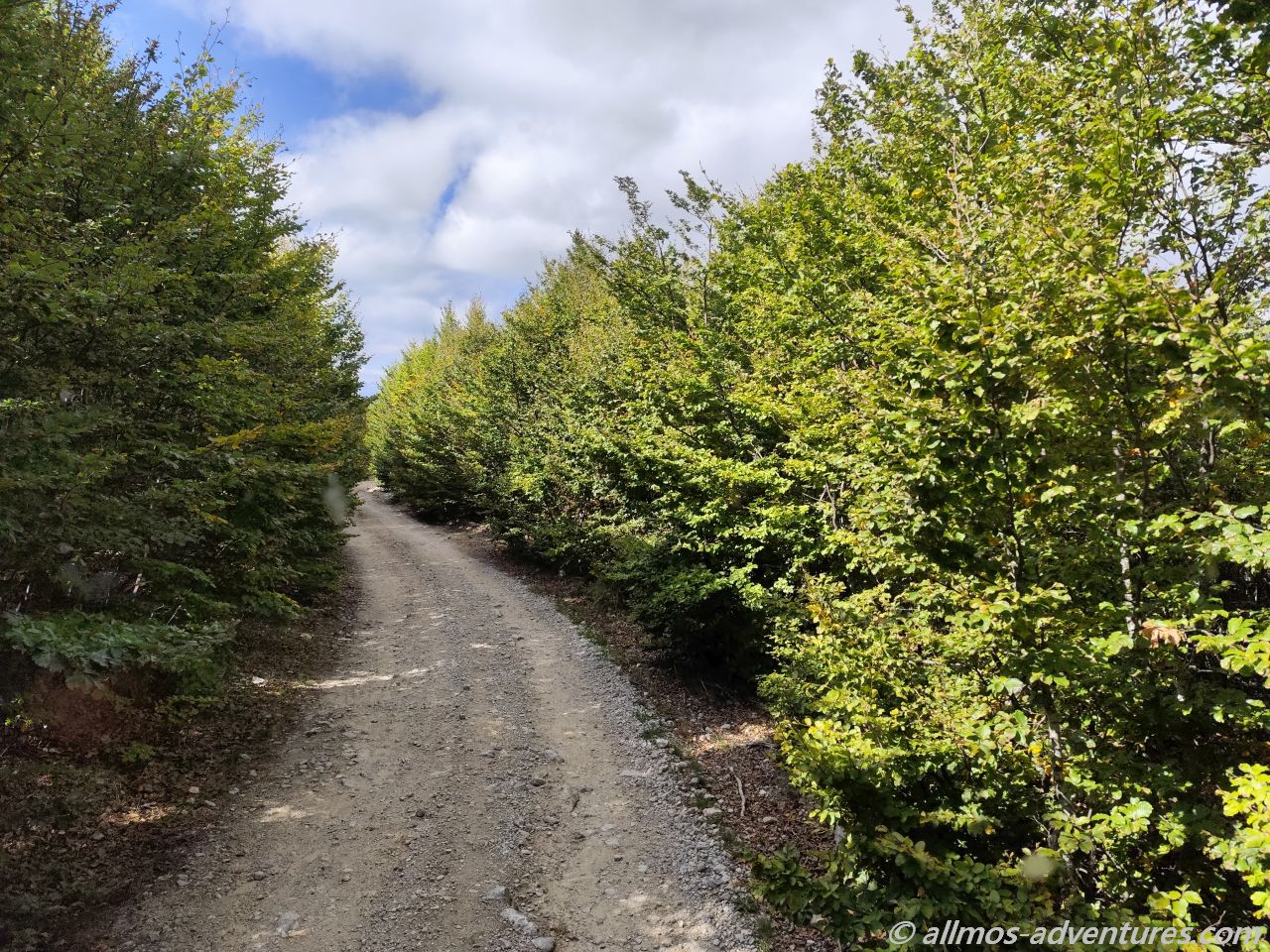 Beinahe hätten wir wenig später den Abzweig rechts verpasst, weil wir so schön auf Teer vorwärtskamen. Inzwischen befanden wir uns auf der zweiten Wikiloc-Strecke (alle drei Strecken gehen nahtlos in einander über).  Und nun lag sie vor uns: die ersehnte Piste. Gleich zu Beginn wurden wir mit einem engen Baumbewuchs und niedrigen Ästen empfangen. Kurzzeitig überlegten wir umzudrehen. Frank schaute sich zu Fuß die Strecke an und weil er weiß, dass mir das nicht behagt, meinte er, dass wir besser nicht auf die Piste fahren sollen.