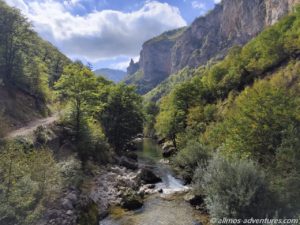 Doch wenn ich dachte, dass es nun entspannter werden würde, so täuschte ich mich. Nachdem wir die Brücke mit dem wunderschönen Canyon überquert hatten (bei großer Hitze ist das Wasser dort sicherlich für ein erfrischendes Bad geeignet), fuhren wir eine Weile an einer Felswand entlang. Zum Glück war der Abgrund auf Franks Seite, so dass ich bei mir nur nach Steinen Ausschau halten musste, während er auf Auswaschungen Acht gab. Seit der Brücke befanden wir uns auf der dritten Wikiloc-Strecke.