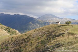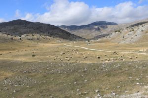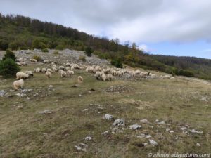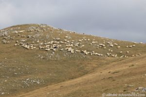 Auf einem der Hügel hatten wir unterwegs eine Schafherde gesehen und irgendwann kam diese bei uns vorbeigezogen. Der nicht englisch oder deutsch sprechende Schafhirte fragte, ob wir Piva hätten. Nun gut, wir hätten Radler in Pfandflaschen aus Deutschland, aber kein richtiges Bier im Angebot. Stattdessen schlug Frank vor einen Schnaps mit ihm zu trinken. Dieses Wort kannte er zwar nicht, aber nach zwei Gläsern beurteilte er den Trauben-Likör als „dobro“, also „gut“. Wir schossen noch schnell ein Foto und dann musste er auch schon seiner Herde hinterhereilen.