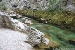 Für unseren Allmo mit 2,50 m Breite, ca. 3,30 m Höhe und einer Länge von 6,80 m (Achtung: unser Radstand beträgt nur 3,20 m) war der Weg im Grunde gut zu meistern. Die herabhängenden Äste und vielen Laub-Streicheleinheiten störten uns weniger. Wir sind aber auch froh, dass wir keinen neu lackierten Koffer haben, denn dann tut jeder Kratzer richtig weh. Etwas mehr Obacht mussten wir geben, wenn heruntergefallene Steine am Wegesrand lagen, damit wir uns nicht die Reifen beschädigen.