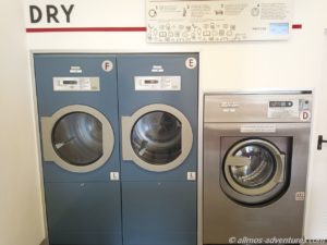 Dann wurde es auch schon Zeit zum Waschsalon zurückzukehren, denn die Wäsche war fertig. Bis auf die Spültücher wanderte alles von der Waschmaschine in den Trockner. Diesen fütterte ich erstmal für 10 Minuten bei mittlerer Temperatur.