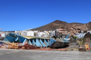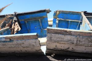 Zuvor passierten wir ein paar Flüchtlingsboote, die auf dem Trockenen lagen. Diese werden an Land mit einer Flex in zwei Hälften zerlegt. Warum, wissen wir nicht. Somit sind sie aber auf keinen Fall mehr seetauglich.