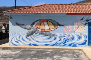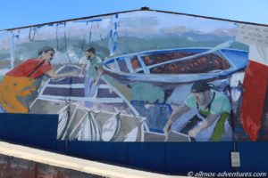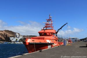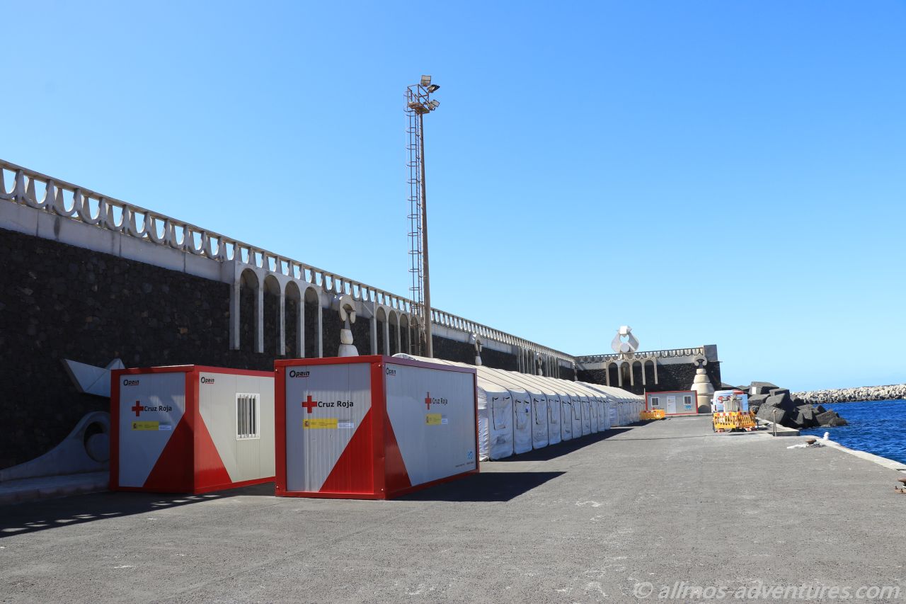 Am Hafen waren Zelte aufgebaut, Container vom roten Kreuz standen daneben. Zwei Sicherheitsboote lagen an Land. Im Moment wurde wohl kein Flüchtlingsboot erwartet, sonst wäre es dort bestimmt ganz schön wuselig zugegangen. Durch einen Vorhang, der allerdings mit einem Schloss und mit Ketten gesichert war, konnten wir durch einen Spalt in eines der Zelte blicken. Auf der einen Seite befanden sich so eine Art Umkleidekabinen und auf der anderen Seite waren Kartons aufeinandergestapelt und wir konnten Schuhe für Kinder erkennen.