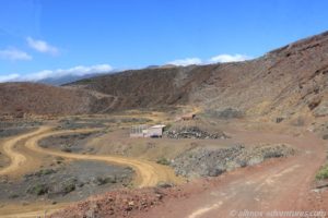 Da sich La Restinga in einer Sackgasse befindet, mussten wir wieder ein Stück den gleichen Weg zurück fahren. Unterwegs bog Frank auf eine geschotterte Piste ab, von der wir auf dem Hinweg dachten, dass sie zu einem ehemaligen Steinbruch führt. Vielleicht war es auch mal einer, doch jetzt bzw. zuletzt wurde das Gelände wohl für Autorennen genutzt. Eine kleine Rennstrecke, mit Kurven und Autoreifen als Begrenzung, war in dem Gelände angelegt worden. Ein Schrottauto stand neben dem kleinen Gebäude, das fährt definitiv keine Rennen mehr.
