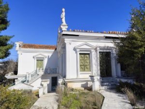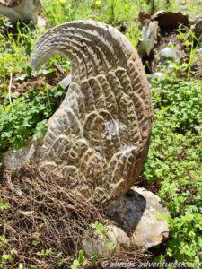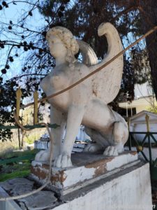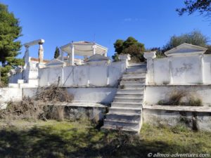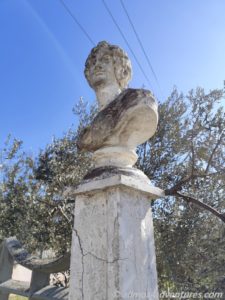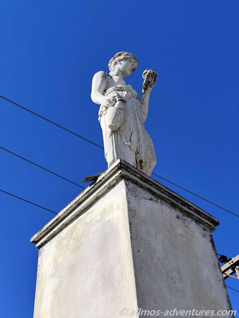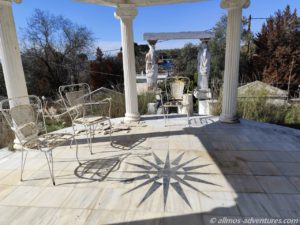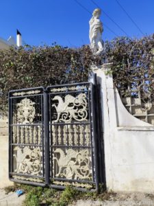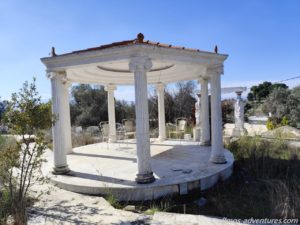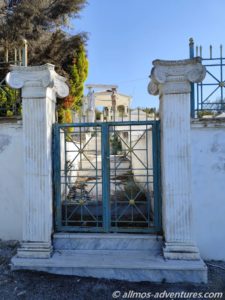 Weil wir wieder in Richtung Chalkida fuhren, kamen wir erneut an der Stelle vorbei. Wir parkten Allmo in der Nähe des Abzweigs und machten uns zu Fuß auf den Weg. Bereits der Eingangsbereich an der Straße war mit griechischen Figuren und Gegenständen verziert. Das zweiflügelige Tor, mit Ornamenten, stand offen. Zu Fuß folgten wir dem Weg, vorbei an Schafen, die uns interessiert ansahen.