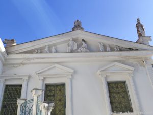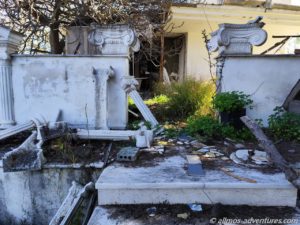 Wir näherten uns einem Objekt, dass bei Gockel auch Lost ausgesehen hatte und natürlich handelte es sich um einen Lost Place. Die verlassene Villa war sehr pompös mit griechischen Säulen und Figuren errichtet worden. Eine breite Treppe führte zum Haupteingang, welcher verschlossen war.
