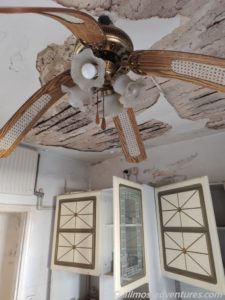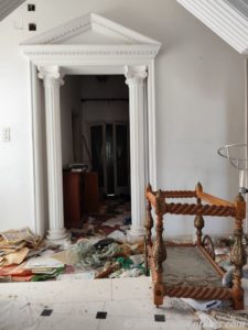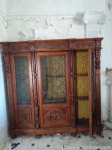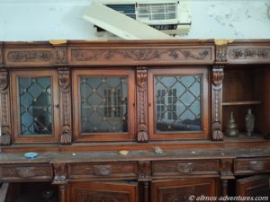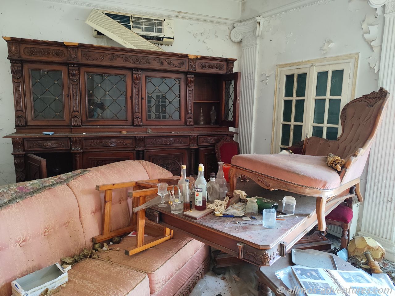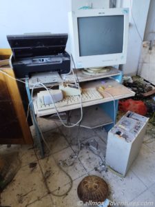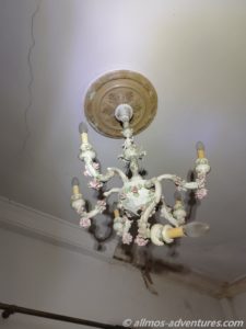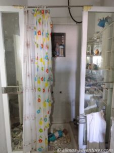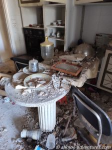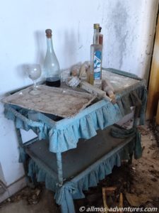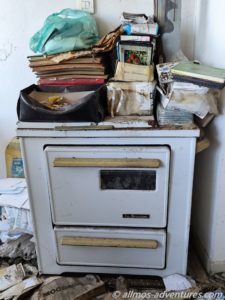 Im Erdgeschoss gab es eine Art Einliegerwohnung, deren Tür offen stand. Über eine schmale Metalltreppe gelangten wir von dort in die obere Etage. Das komplette Gebäude war möbliert, wobei nicht mehr alles an Ort und Stelle stand. Außerdem herrschte großes Chaos. Es lag viel Zeug durcheinander auf dem Boden verstreut. Auch war in der oberen Etage Putz von der Decke heruntergefallen. Wohingegen im Erdgeschoss Schafe oder Ziegen durch den Flur gelaufen waren.