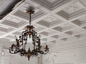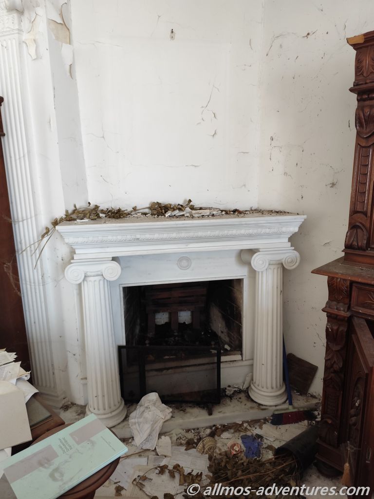 In der oberen Etage, also der eigentlichen Villa, zog sich der Stil des Äußeren fort. Griechische Säulen zierten die Türrahmen und den Kamin. Zeitungen von 2011 lagen auf dem Boden im Flur.