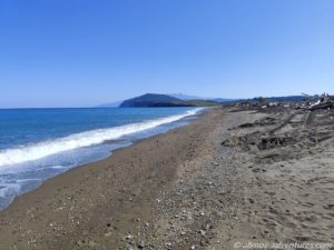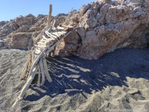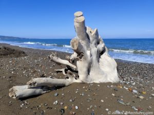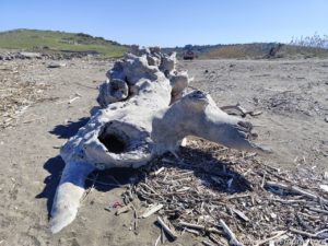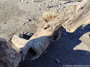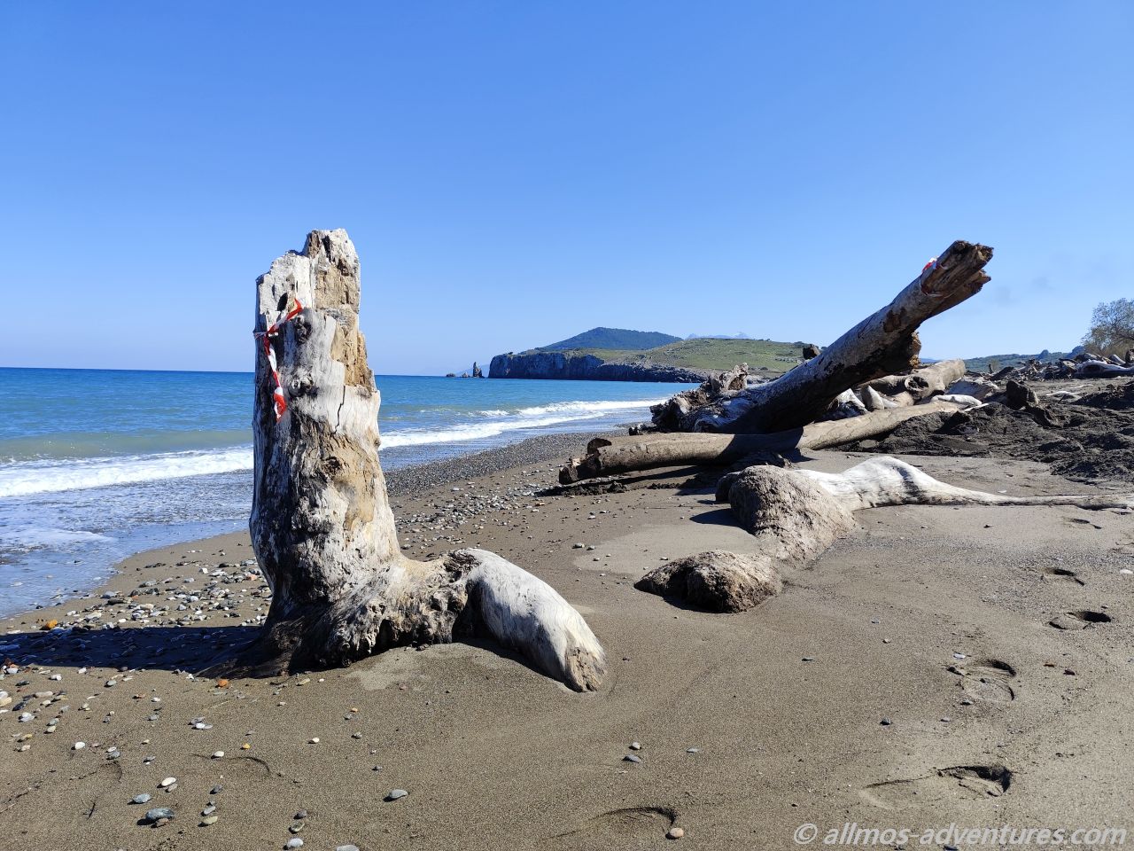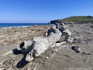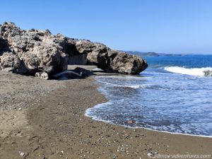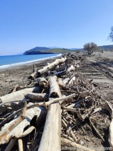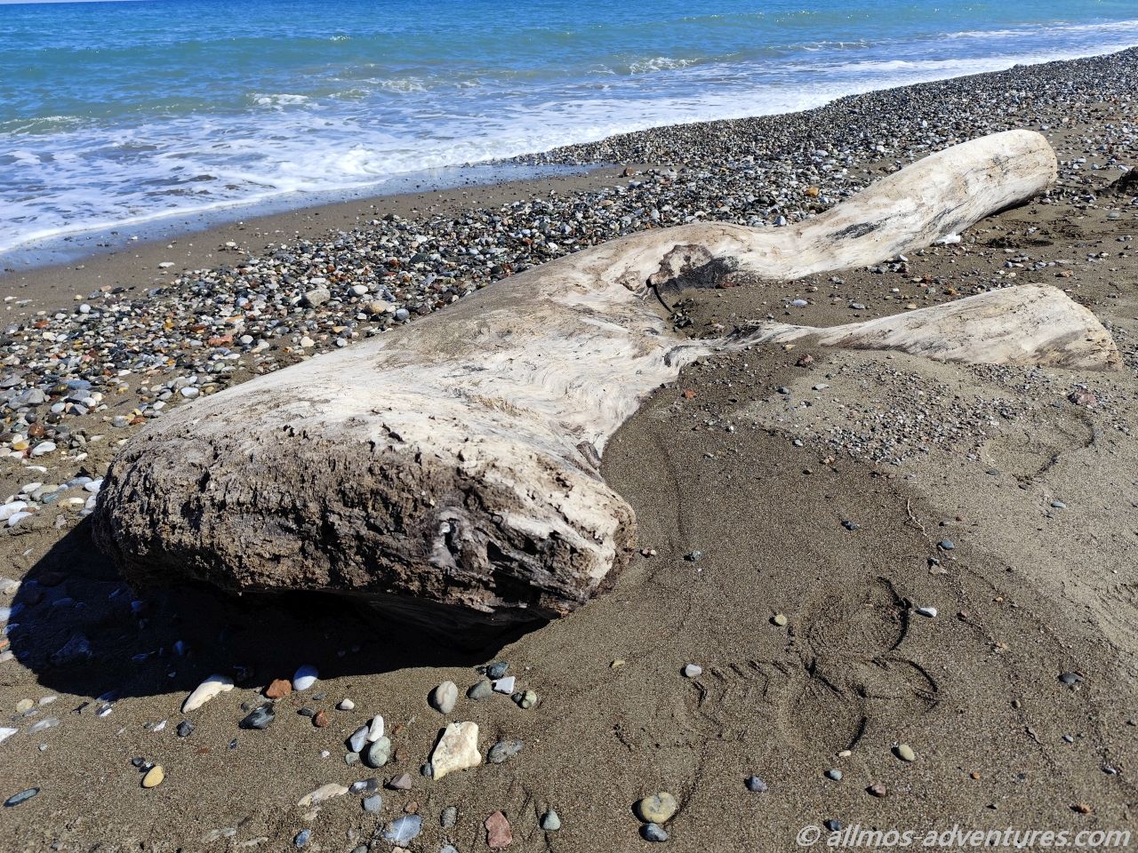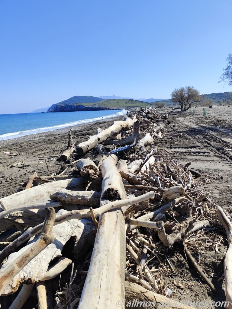 Wir parkten Allmo im rechten Bereich, also hin zu der Flussmündung mit Blick auf ein paar kleine abstehende Felsen (ein kleines Triopetra, nur das die abstehenden Felsen hier keinen Namen hatten).  Recht bald entdeckten wir, dass im linken Bereich (Richtung Norden), Aufräumarbeiten im Gange waren. Eine Raupe und ein Radlader waren fleißig damit beschäftigt, das Holz vom Strand in Richtung Land zu schieben. Vermutlich soll so verhindert werden, dass einzelne Hölzer wieder zurück ins Meer gezogen werden. Und so lässt sich das ganze Zeug auch besser abtransportieren. Später sahen wir einen LKW, der für den Abtransport eingesetzt wurde. Na, der hat noch viel zu tun, bis der Strand wieder komplett geräumt ist.