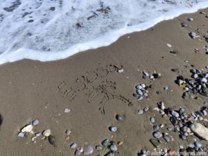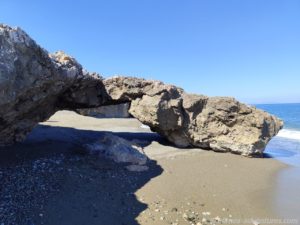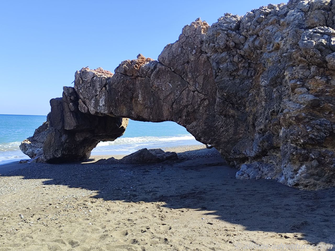Wir spazierten über den Geh-/Fahrweg ans nördliche Ende des Strandes. Dort befindet sich, kurz hinter der geschlossenen Taverne, ein kleiner Felsbogen direkt am Meer. Trockenen Fußes konnten wir über den Strand zu dem Felsbogen gelangen und durch ihn hindurch gehen. Den Rückweg gingen wir am Strand entlang. So frisch wie die Raupenspuren waren, können die erst heute mit den Schiebearbeiten gestartet haben.