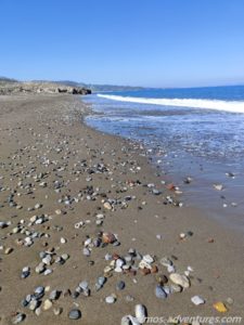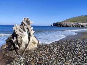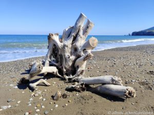 Von Christine und Peter wussten wir bereits, dass der Strand bei Kria Vrisi von Baumstämmen übersät ist und dass es unterwegs ein Haus gibt, das halb abgerutscht ist, weil die Erde drunter weggebrochen war. Alles trafen wir genau so vor.