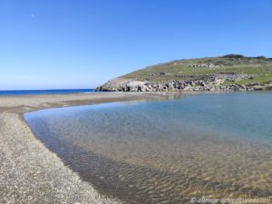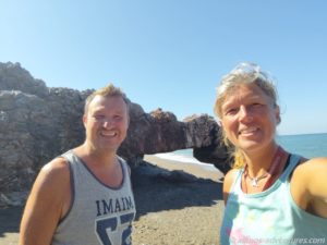 Wir genossen die Sonne und das schöne Wetter. Neben Allmo war es windstill und wir konnten es gut draußen aushalten. Für die archäologische Stätte Kerinthos, die vor uns (also an den südlichen Bereich des Strandes angrenzte), interessieren wir uns nicht weiter. Wobei der grüne Hügel, auf dem sich die Stätte befindet, schön aussieht.