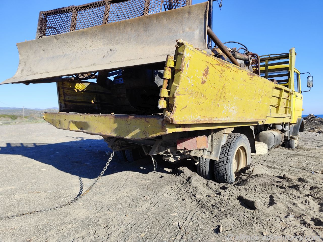 Nach dem Frühstück fuhren wir weiter. Und ich dachte so aus der Ferne, dass der LKW mit dem schweren Teil auf der Ladefläche aber mutig war, so weit in den etwas losen Sand zu fahren. Beim näher kommen war klar, das er sich eingegraben hatte. Eine Kette zum Abschleppen hatte der Herr schon dran befestigt. Doch die war Frank zu kurz. Besonders wenn so eine Kette reißt und dann womöglich in unsere Windschutzscheibe fliegt, haben wir gar nichts gewonnen. Während Frank die Abschlepp-Schekel und unser kurzes Seil holte, war die Raupe angesprungen. Diese musste mit Starthilfekabeln überbrückt werden. Jetzt konnten sich die Herren selbst aus ihrer misslichen Lage befreien und Frank bekam kein Abschlepp-Rettungs-Video. Auch nicht schlimm. Wir fuhren winkend davon.