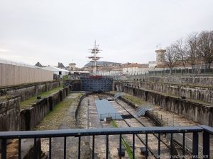 Gegen 12  Uhr hörte es dann doch tatsächlich auf zu regnen, nur der Wind war ungemütlich. Dennoch schnappten wir unsere Räder und radelten in die Stadt. In Rochefort befand sich bis 1927 das größte Marinearsenal Frankreichs. Baracken und andere Gebäude zeugen davon. Leider stand der Nachbau der Fregatte Hermione nicht im Hafen/Trockendock. Schade.