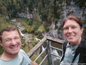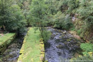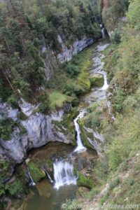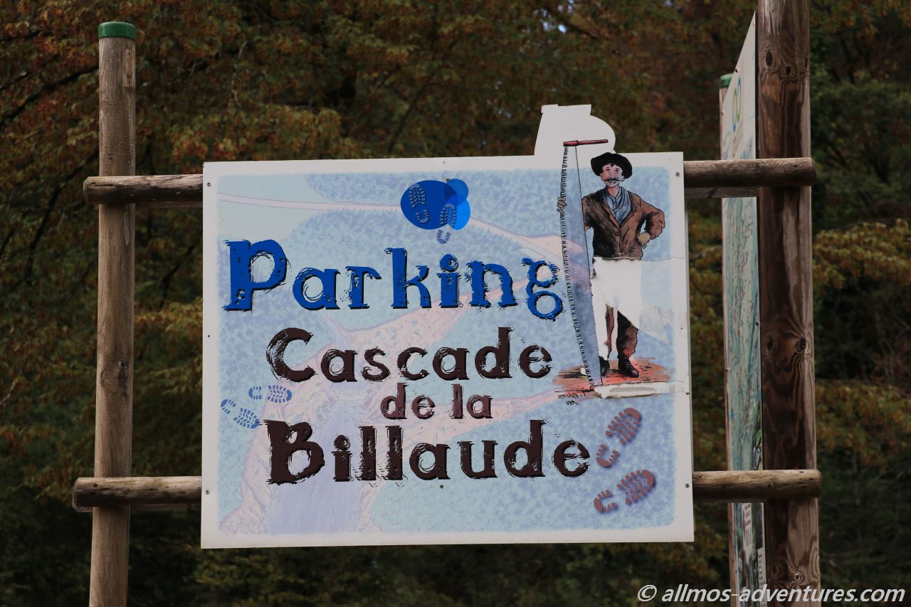 Spontan stoppten wir, auf nicht ganz halber Strecke an den Wasserfällen Cascade de la Billaude. Franks Füße bekamen etwas Abwechslung vom Pedale treten. Der Weg zu dem oberen Aussichtpunkt auf die Kaskaden liegt nur 60 Meter vom Parkplatz entfernt. Von einer Plattform überblickten wir den Flusslauf mit mehreren Wasserfällen. Auch ganz hinten, war zwischen den Felsen auch noch ein Wasserfall auszumachen.