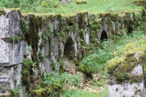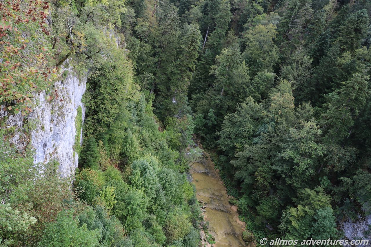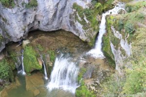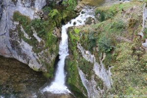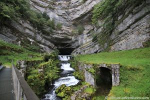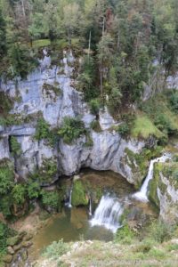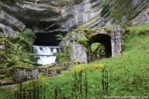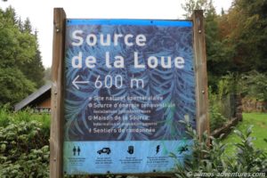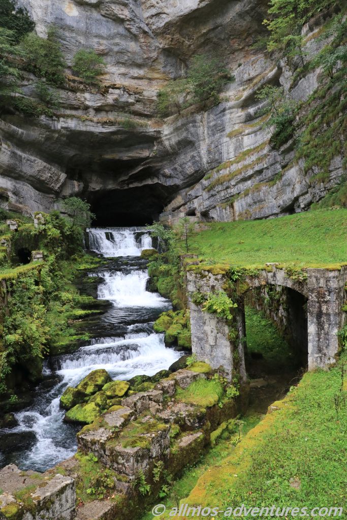 Die erste gut 80 Kilometer lange Etappe führte uns über teilweise schmale Bergstraßen zu der Source de la Loue, in der Nähe der Ortschaft Ouhans. Glücklicherweise regnete es gerade mal nicht, als wir den Parkplatz erreichten. Ein 600 Meter langer Fußweg führte vom Parkplatz zu der Quelle des Flusses Loue. Aus einem gigantisch großen halbrunden Felsen floss das Wasser über mehrere kleine Kaskaden in den Fluss.