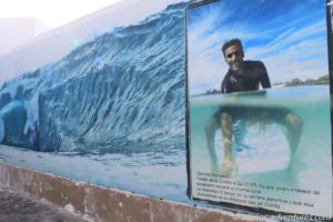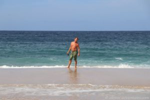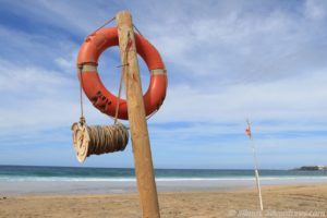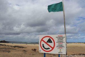 Schwimmen ist an dem Strand verboten Die Strömungen sind zu stark und zudem befinden sich Lavafelsen versteckt im Wasser. Die rote Fahne war gehisst, auch wenn diese vom Wind schon sehr verschlissen war. Zum Erfrischen wagten wir uns jedoch ins Wasser.