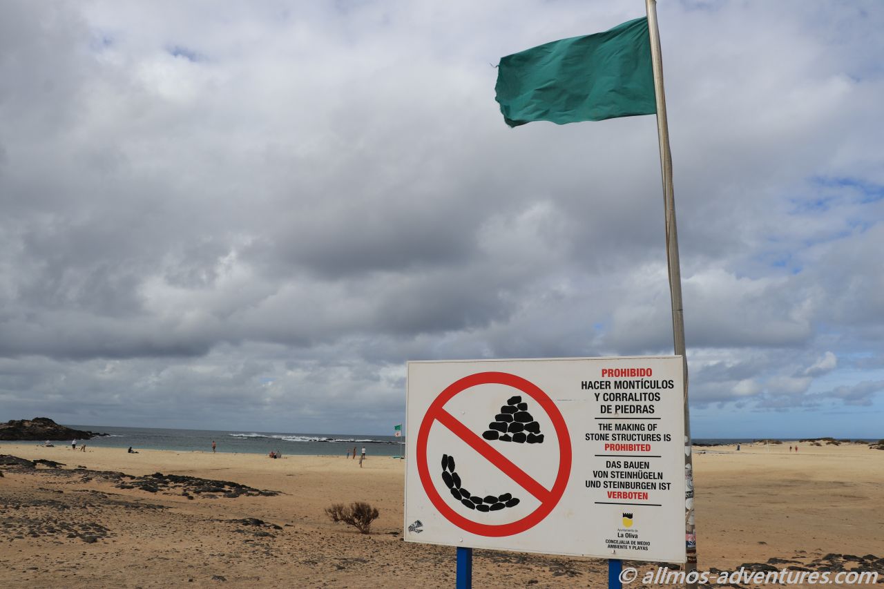 Nördlich von El Cotillo stoppten wir am Strand La Concha. In der sichelförmigen Bucht war das Wasser türkisblau und fiel sanft ab. Ein Paradies für Familien. Entsprechend viele Kinder sprangen dort herum. Das Rettungsschwimmer-Häuschen war sogar besetzt. Gegen Steinmännchen schien hier niemand was zu haben, dafür war das Bauen von Steinburgen verboten.