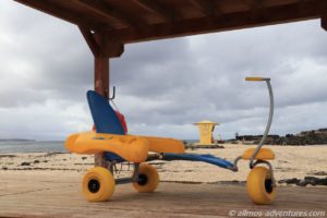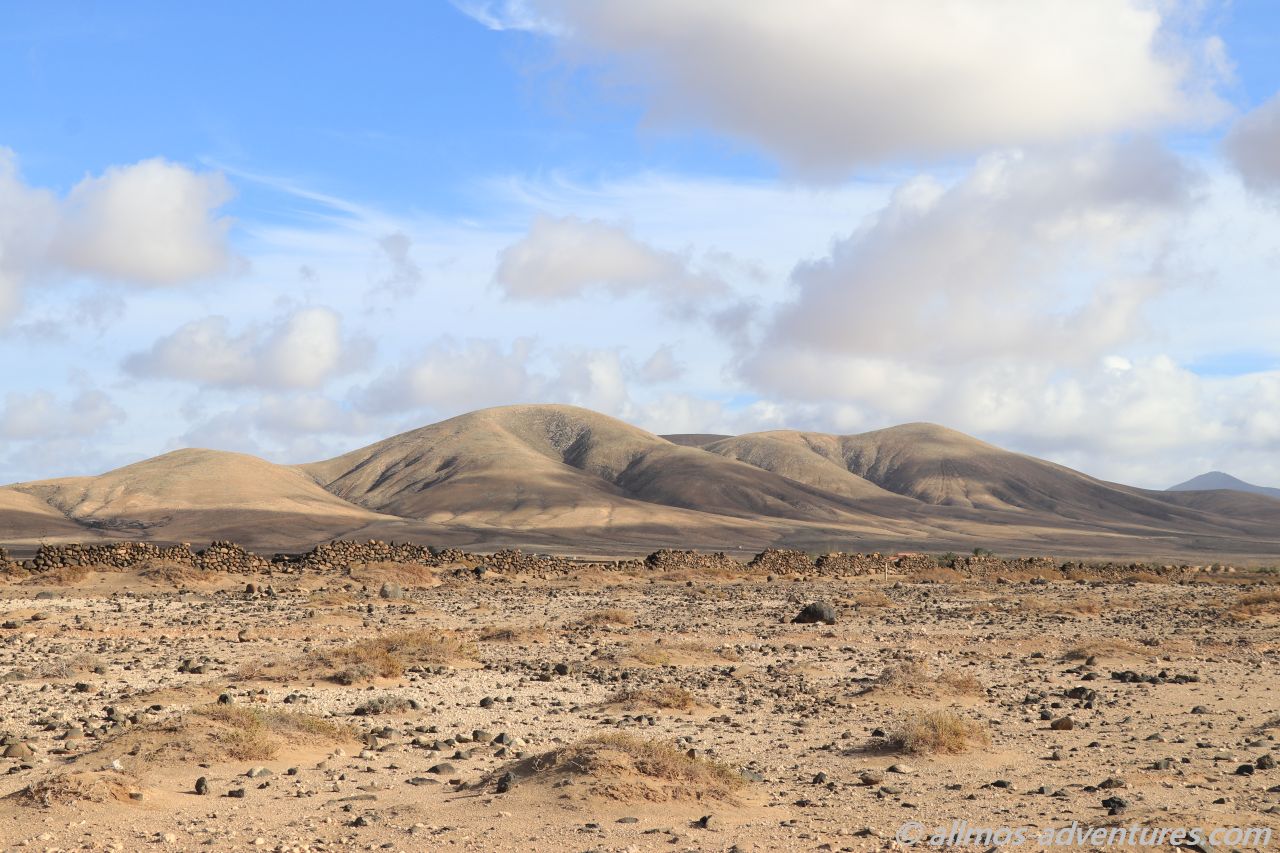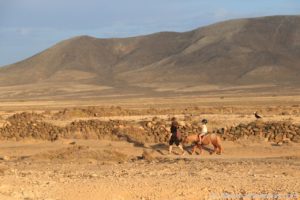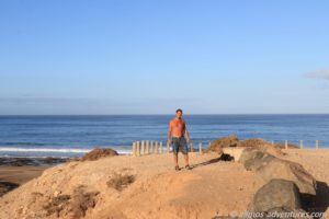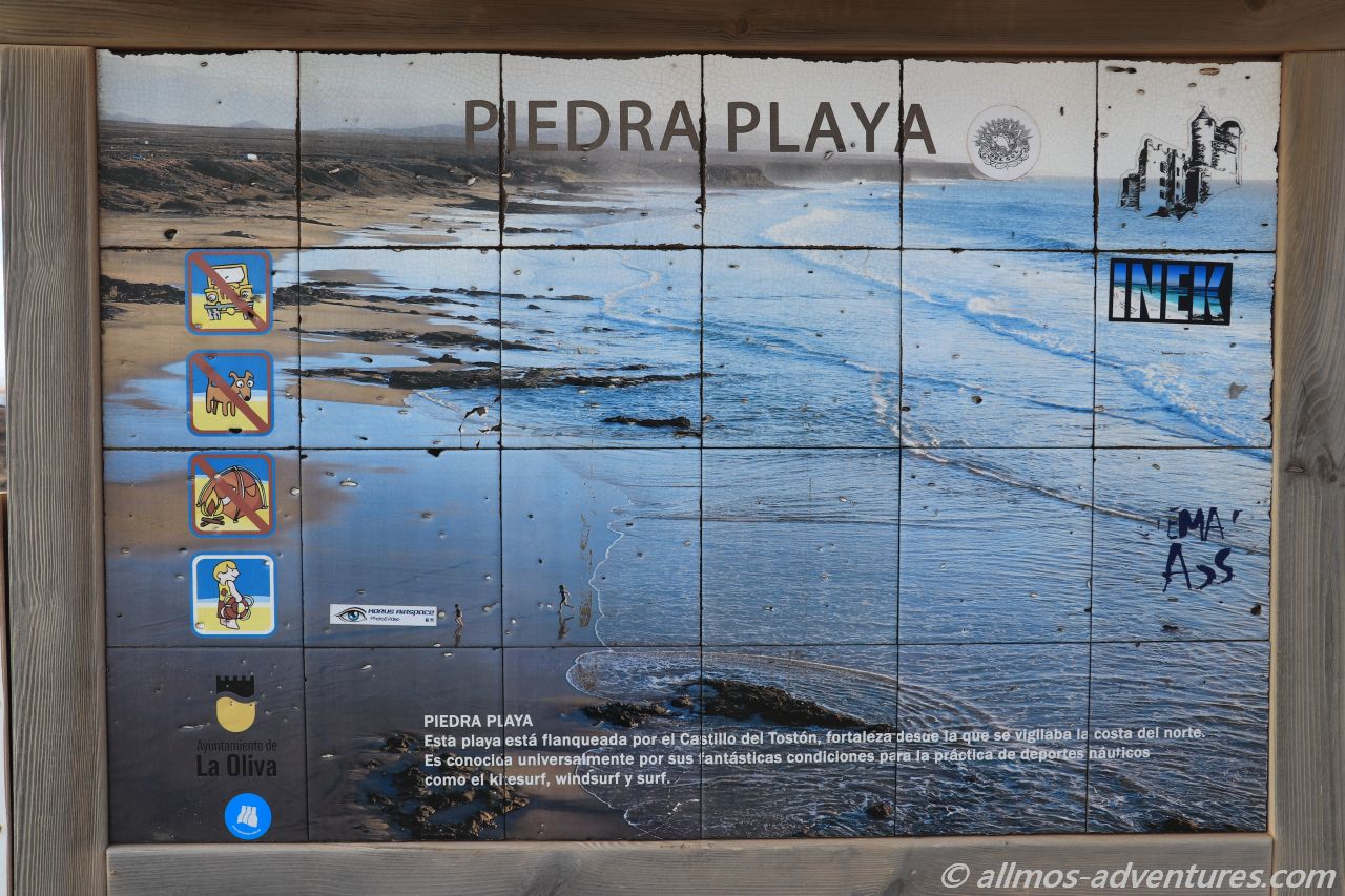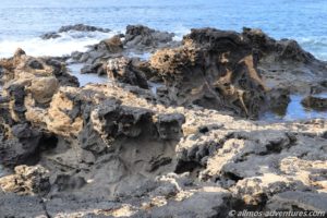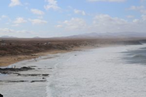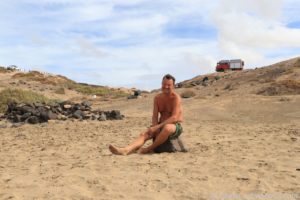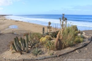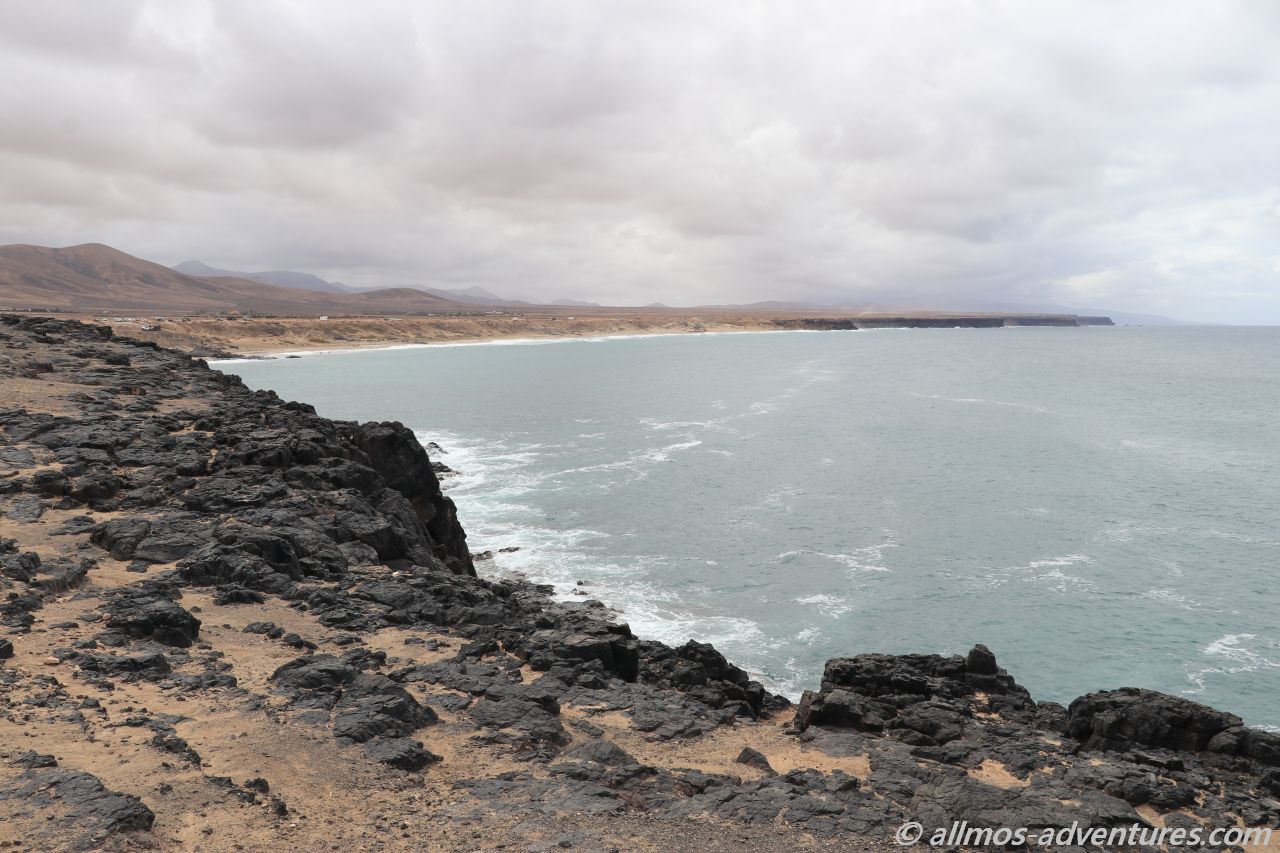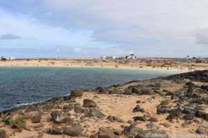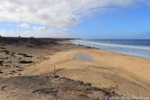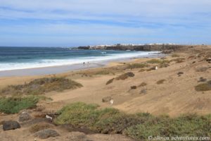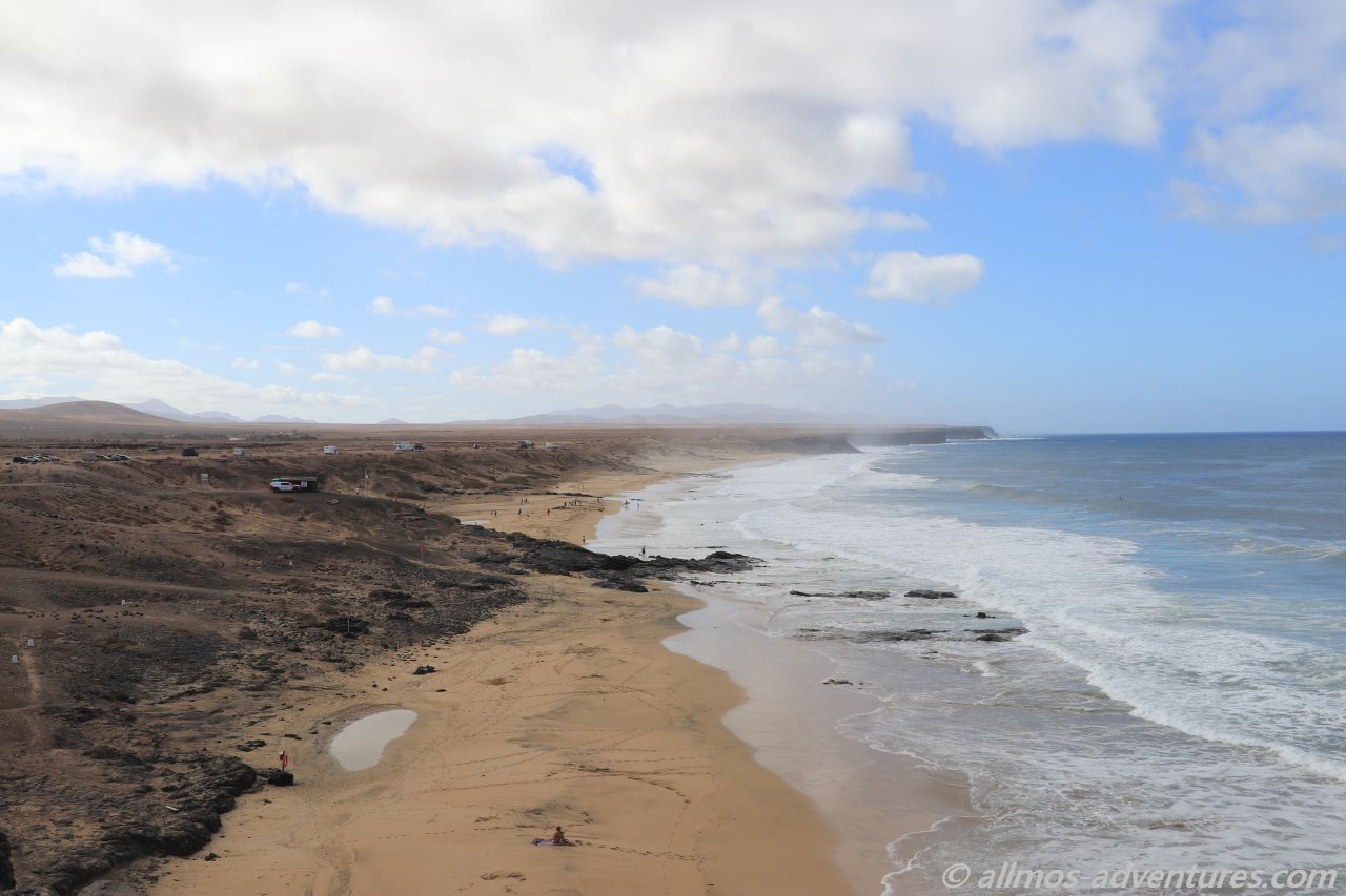 Von unserem Platz führte ein etwas steiler Weg hinunter bis an den Strand, der sich über mehrere Buchten streckt. Weiter Richtung El Cotillo versuchten Surfer ihr Glück. An unserem Strandabschnitt war es sehr ruhig. Wir machten es uns eine dieser Schweinebuchten gemütlich, wobei wir nun – nachdem wir das erste Mal in so einer Bucht lagen – nicht verstehen können, was die Leute daran toll finden. Die Sonne staut sich extremst in diesen Buchten und wenn man flach auf der Decke liegt, dann bekommt man keinen Windzug ab. Stattdessen brutzelten wir in der Sonne.