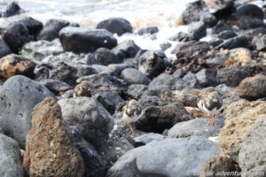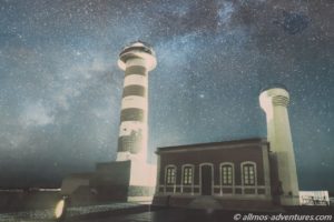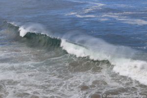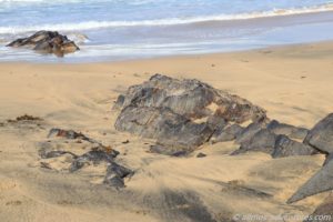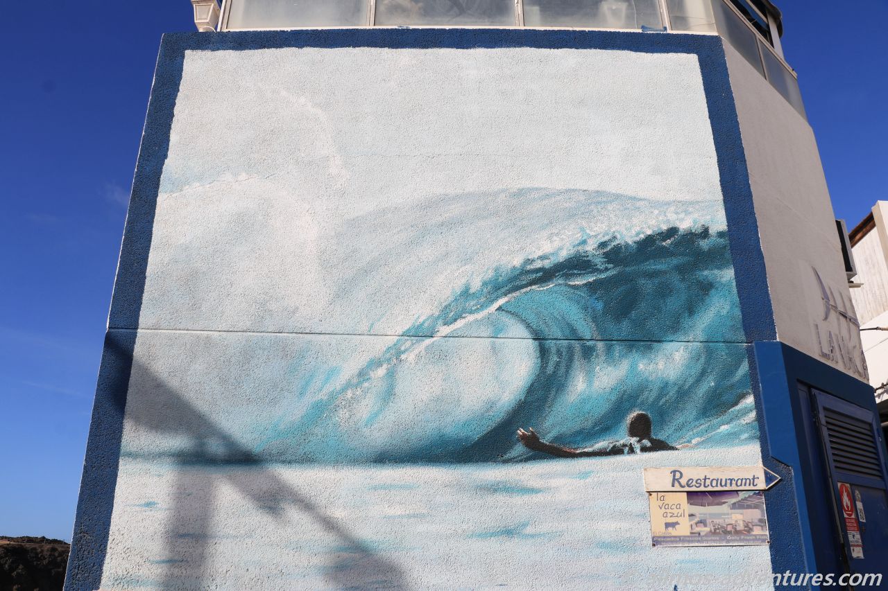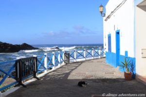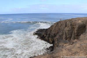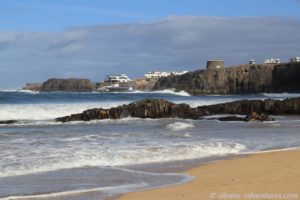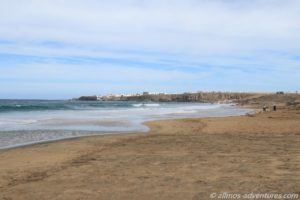 Am Turm und am Wal-Skelett war noch nichts los. Die Menschen schliefen wohl noch. Auf den Klippen neben dem Playa del Castillo sahen wir die Wellen auf den Strand zu rollen. Sie waren eindeutig größer und kräftiger als am gestrigen Tag.