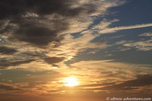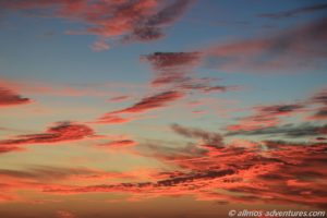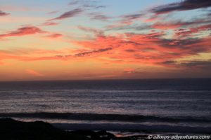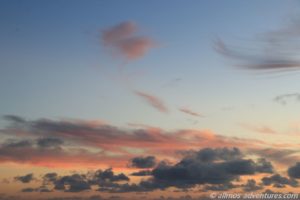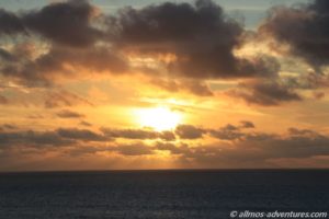 Zum Abschluss des Tages wurden wir mit einem phänomenalen Sonnenuntergang belohnt. Die Sonne tauchte in das Meer ein und anschließend leuchtete der Himmel in den herrlichsten Farben. Manche Wolken sahen so surreal aus. Wir waren schwer begeistert.