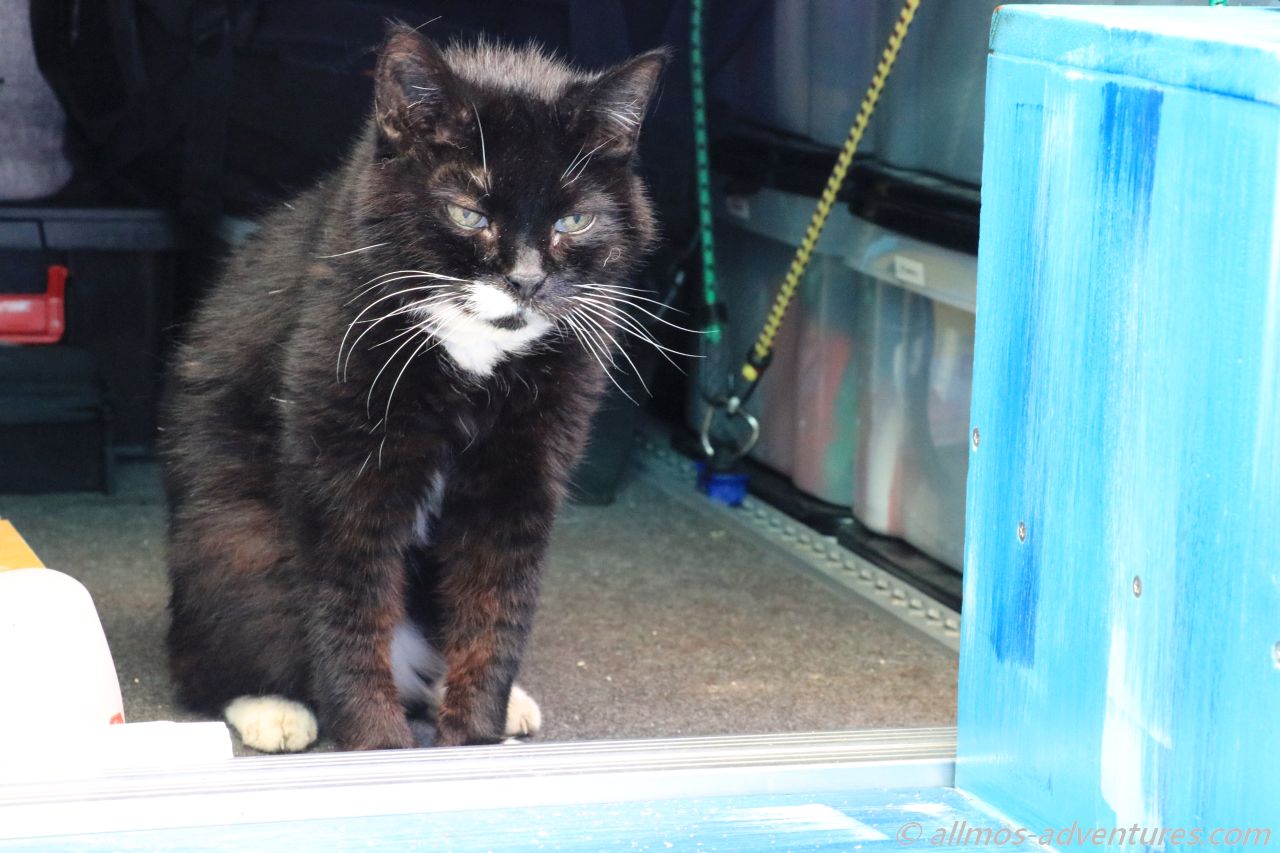 Sonne und Wolken wechselten sich ab. Wobei es bewölkt sehr angenehm war und mit der Sonne viel zu heiß. Zur Mittagszeit flüchteten wir zu Allmo. Während ich mich ins Bett legte und las, saß Frank draußen im Schatten.