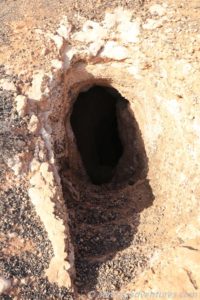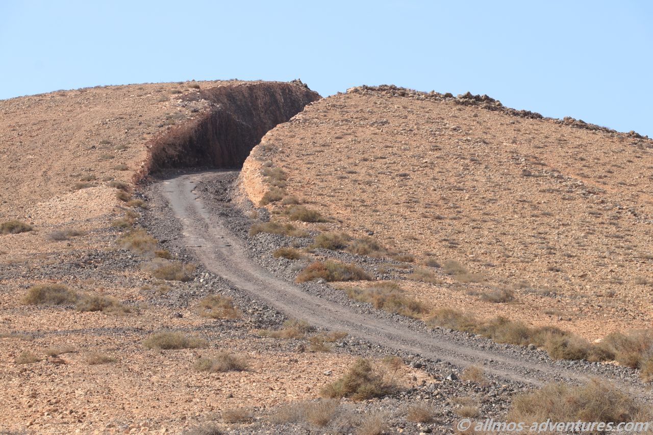 Bereits bei der Zufahrt konnten wir die „Löcher“ im Boden erkennen. Wir parkten Allmo am Rand der geschotterten Piste. Wobei ich Frank zum Einparken beinahe zwingen musste. Denn er wäre gerne weiter den Vulkan vor uns hinaufgefahren. Mitten durch den Berg war eine Schneise (Fahrspur) geschlagen worden. Oben soll sich eine Trinkwasser Destillation befinden.