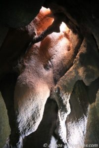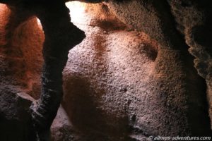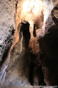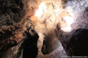 In der ersten Höhle, die wir besichtigen, lagen dicke Felsbrocken auf dem Boden. Doch ein schmaler Weg führte um die Brocken herum, weiter in die Höhle hinein. Ähnlich wie die Lava Höhle „Catedral“ auf Lanzarote, hielten ein paar Säulen das Konstrukt zusammen. Wir vermuten mal, dass dort auch Lavakies abgebaut wurde. Wissen es aber nicht. Frank kroch durch einen kleinen Durchgang, nur um dann am gleichen Eingangsbereich wieder rauszukommen. Dort waren die unterschiedlichen Schichten (dunkel und hell) auch sehr gut zu erkennen. Den linken Bereich hatten wir beim Betreten gar nicht wahrgenommen, weil’s dort so dunkel war. Im mittleren Bereich befanden sich hinter den herabgefallenen Felsbrocken Deckenöffnungen, durch die Licht in die Lava Höhle drang.