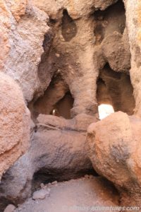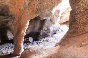 Frank setzte dann doch rückwärts und wir gingen zu Fuß die wenigen Meter bis zu den Lava Höhlen. Bereits beim Betreten des Abbaubereichs vielen mir die unterschiedlichen Farben der Felsen auf. Während das Gestein rechts von mir schwarz war, war die andere Seite sandfarben.