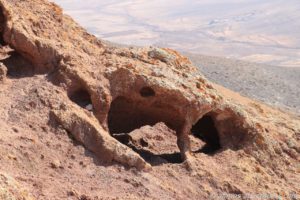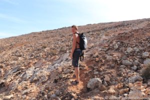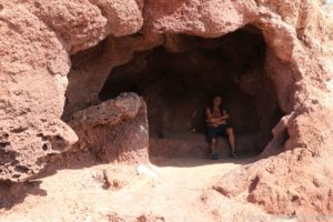 Auf dem Rückweg mussten wir wieder kraxelnd unseren Weg nach oben suchen. Bei der kleinen Höhle legten wir wieder eine kleine Pause ein. Auf dem kurzen Stück vom Felsbogen bis zur Höhle waren wir kräftig ins Schwitzen gekommen. Es fehlte auf der Seite vom Berg eine erfrischende Brise.