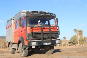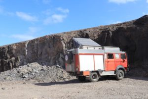 Keine Menschenseele war weit und breit zu sehen. Doch die Reifenspuren auf dem Boden zeigten, dass sich wohl genügend Leute hierhin verirren. Wir parkten Allmo neben der Felswand, und ließen somit den Weg zum Strand frei.