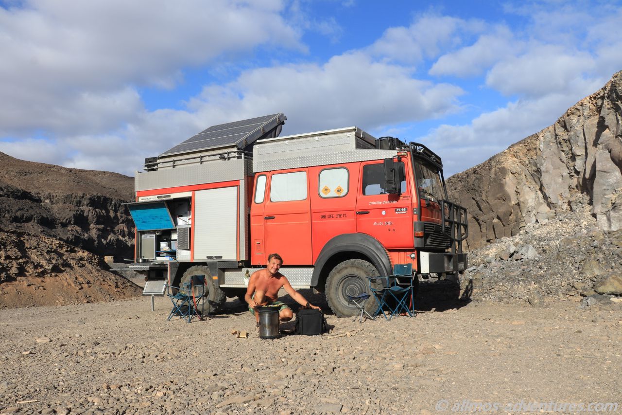 Frank entdeckte, dass wir einen Nachbarn haben, der ungefähr sieben Buchten entfernt auf der Klippe parkte. Wir waren gerade mit dem Abwasch fertig, als ein Land Rover mit Stuttgarter Kennzeichen die Piste entlang fuhr und dann auf unseren Strand gefahren kam. Der Landi durfte das kleine Plateau neben uns erklimmen und auch einmal an den Strand runter fahren. Ich dachte schon, dass die dort stehen bleiben wollten, was sie nicht taten. Es ging wieder den Hügel hinauf und hinunter und dann sahen wir nur noch die Rücklichter. Also hatten wir die Bucht weiterhin für uns allein.